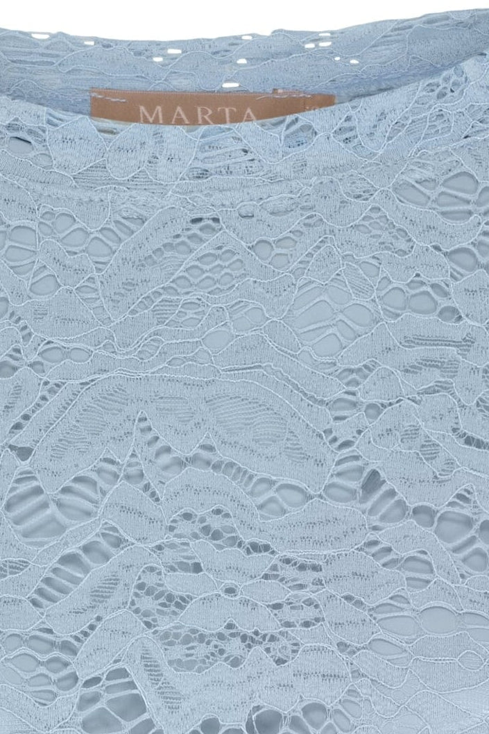Hellblaue Spitzenbluse von Marta du Château. Die Bluse ist ein Pullover ohne Verschluss und hat ein detailliertes Spitzenmuster über die gesamte Oberfläche.