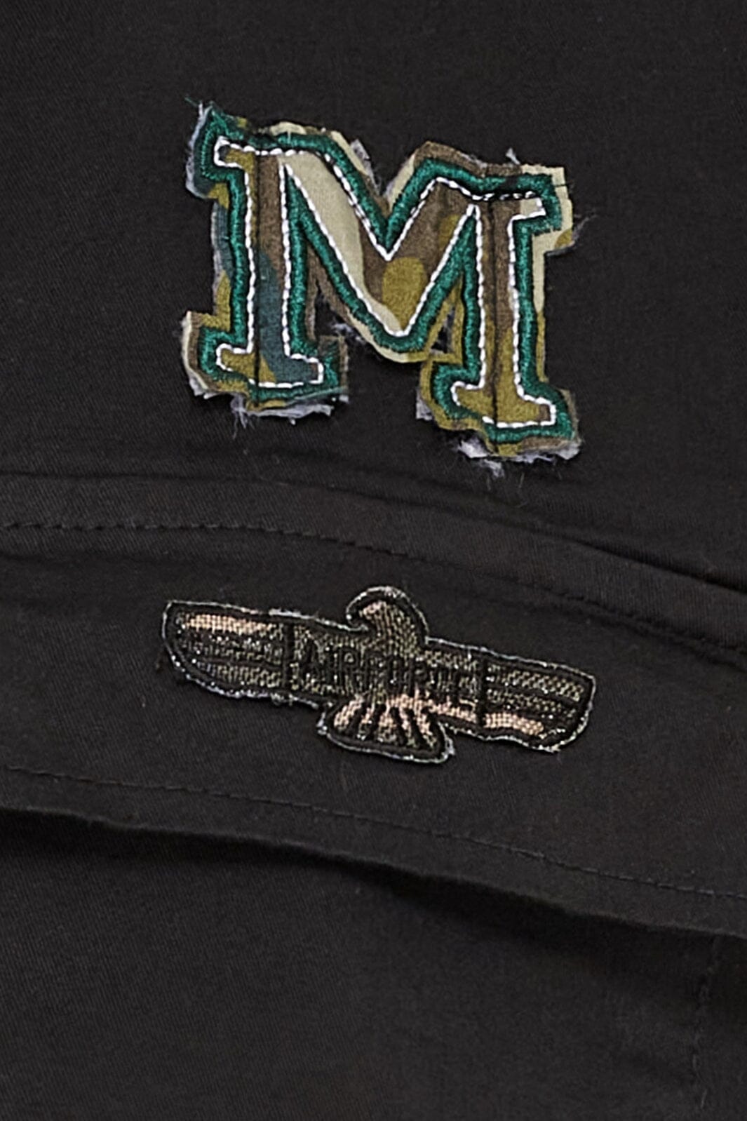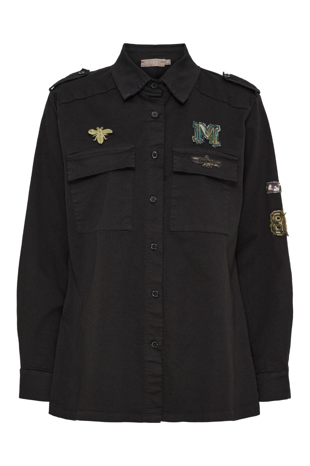 Schwarze Jacke von Marta Du Chateau mit Hemdkragen und Knöpfen. Sie hat bestickte Patches mit Biene und M-Logo sowie dekorative Schulterklappen, die einen militärisch inspirierten Look verleihen.