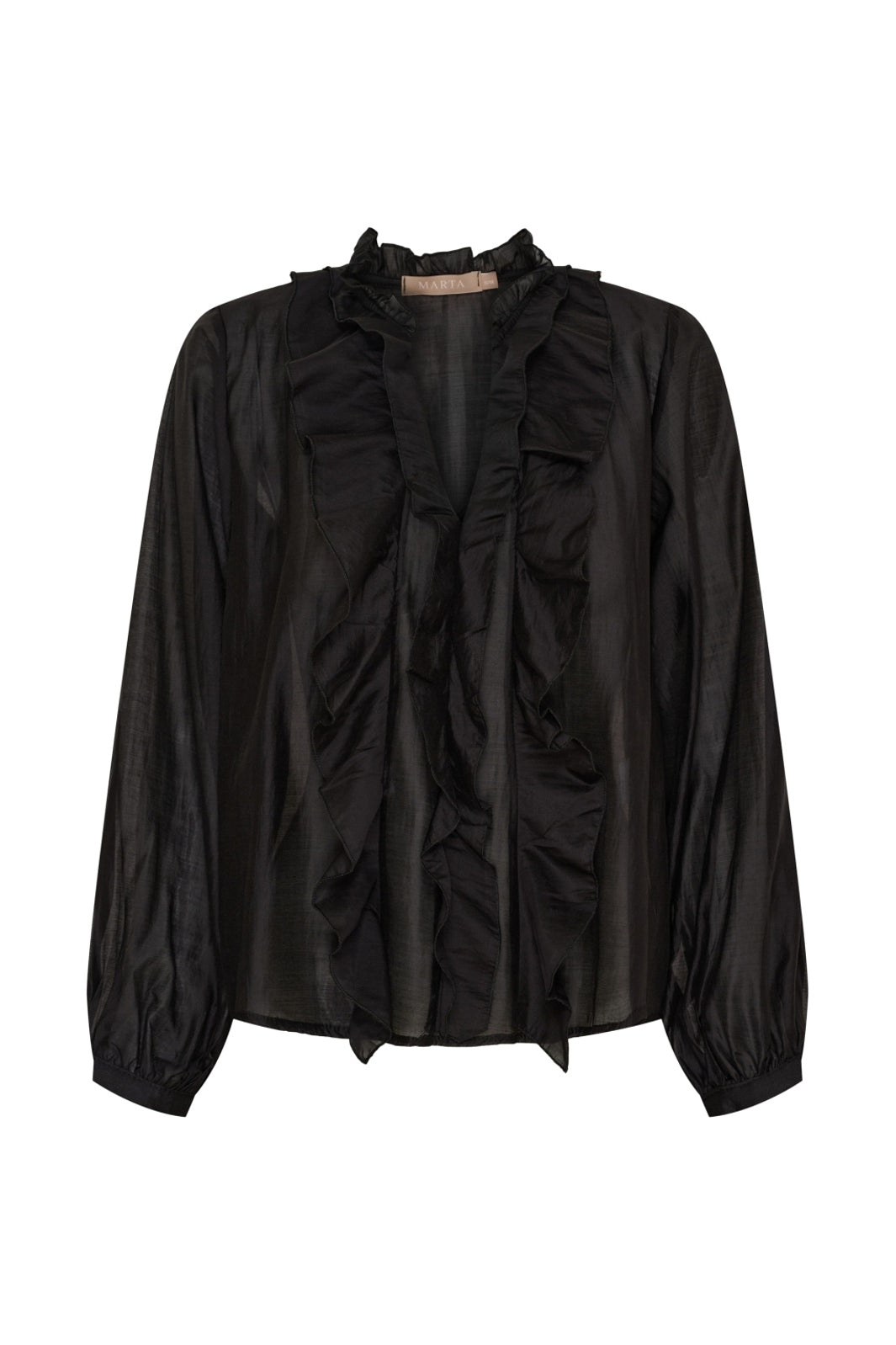 Schwarzes Hemd von Marta Du Chateau mit V-Ausschnitt und Rüschendetails. Das Hemd hat lange Ärmel und besteht aus einem leichten, durchsichtigen Material mit Rüschen entlang des Ausschnitts.