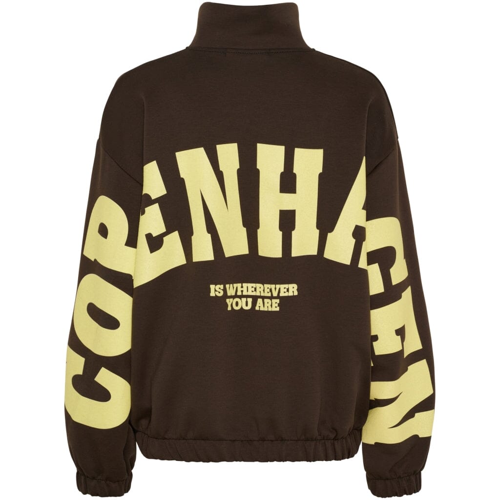 Dunkelbraune Strickjacke von Marta Du Chateau mit gelben Details. Die Strickjacke hat einen Reißverschluss vorne und elastische Bündchen. Sie eignet sich sowohl für entspannte als auch für aktive Situationen.