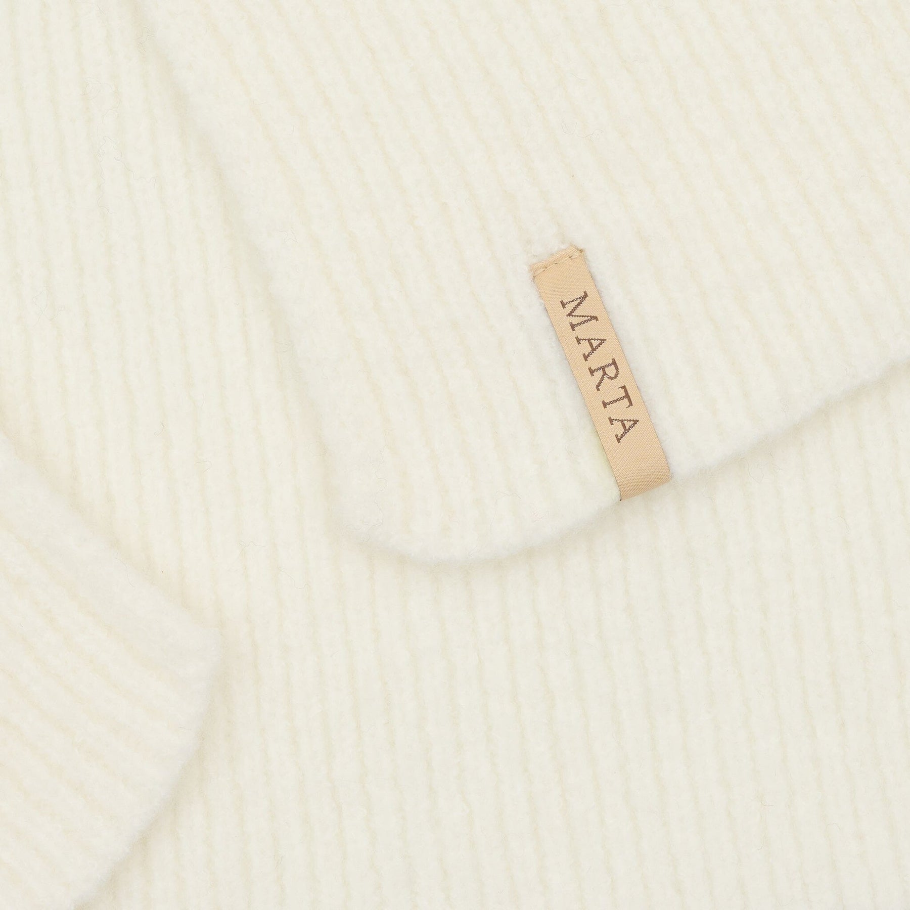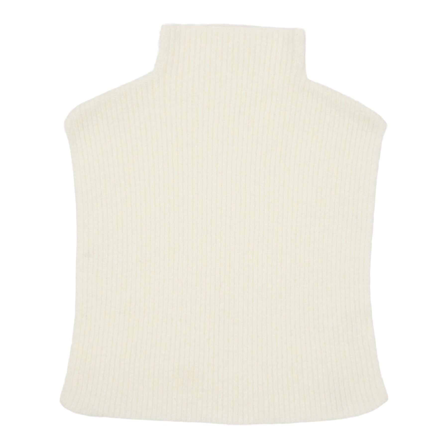 Weißes Schal von Marta Du Chateau mit hohem Kragen und Rippenstrickdesign. Das Schal hat eine neutrale Offwhite-Farbe und eine gute Struktur, die Wärme um den Hals bietet.