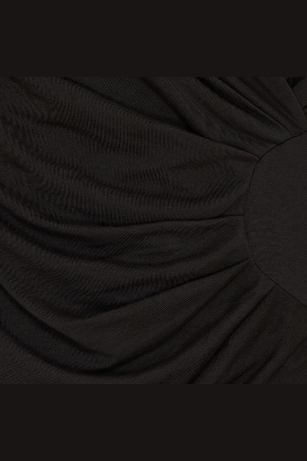 Schwarze Bluse von Marta Du Chateau mit Wickeleffekt. Die Bluse hat Falten auf der Vorderseite und einen V-Ausschnitt, der ihr einen sanften Fall verleiht.
