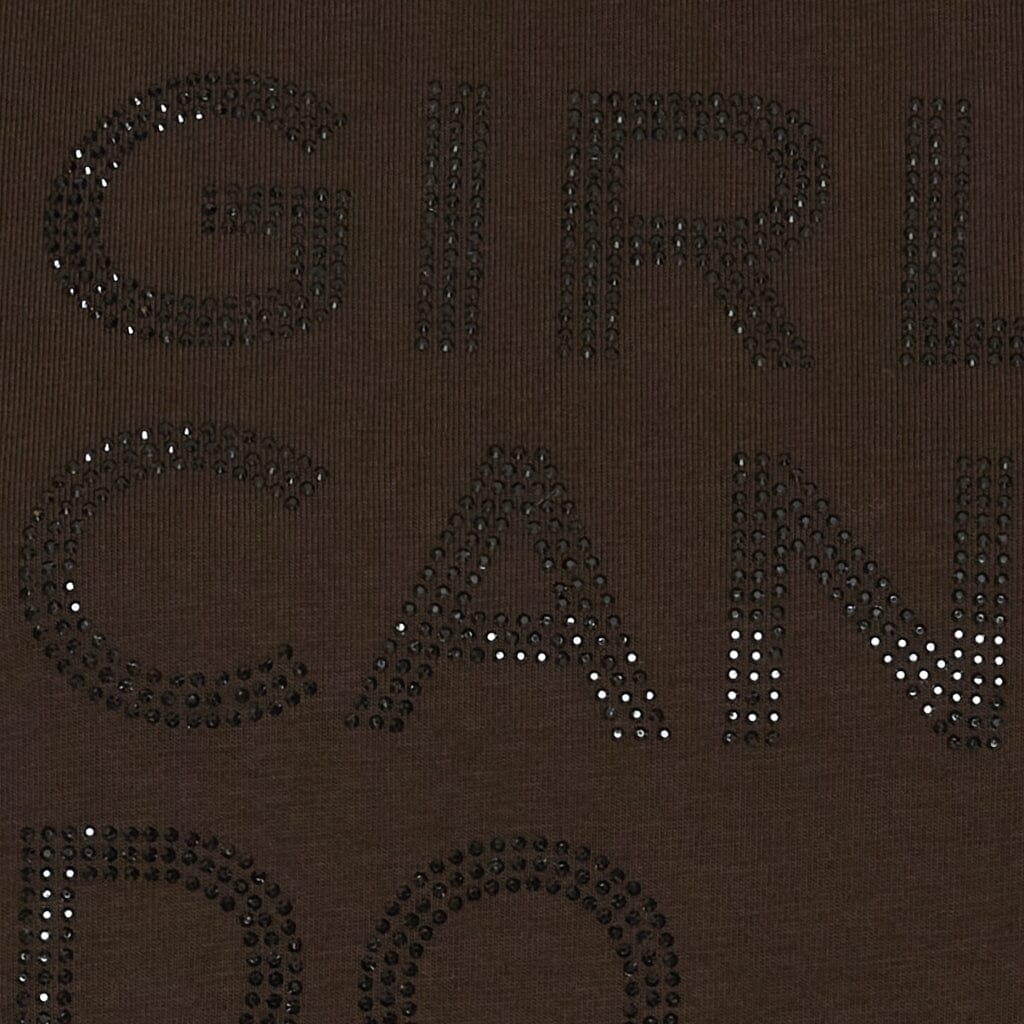 Ein dunkelbraunes T-Shirt von Marta Du Chateau mit dem Aufdruck GIRLS CAN DO ANYTHING in glänzenden Pailletten auf der Vorderseite.
