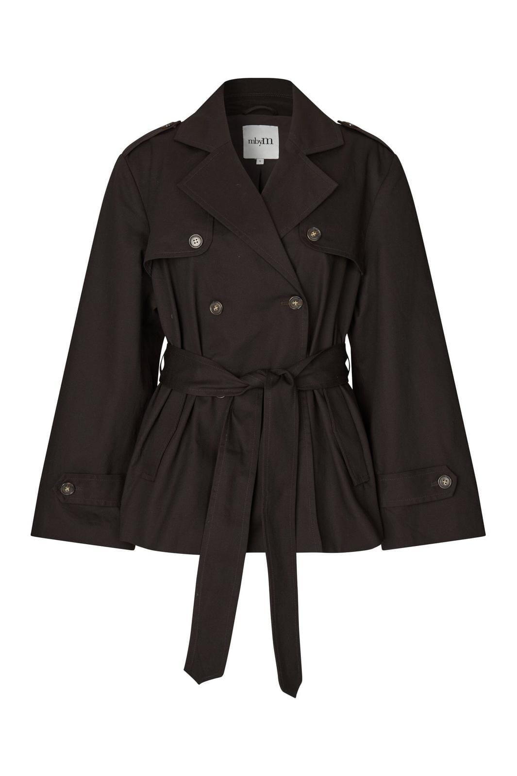 Braune Jacke von MbyM aus Baumwolle. Die Jacke hat ein doppelreihiges Design mit Gürtel in der Taille und Bindeband-Details.