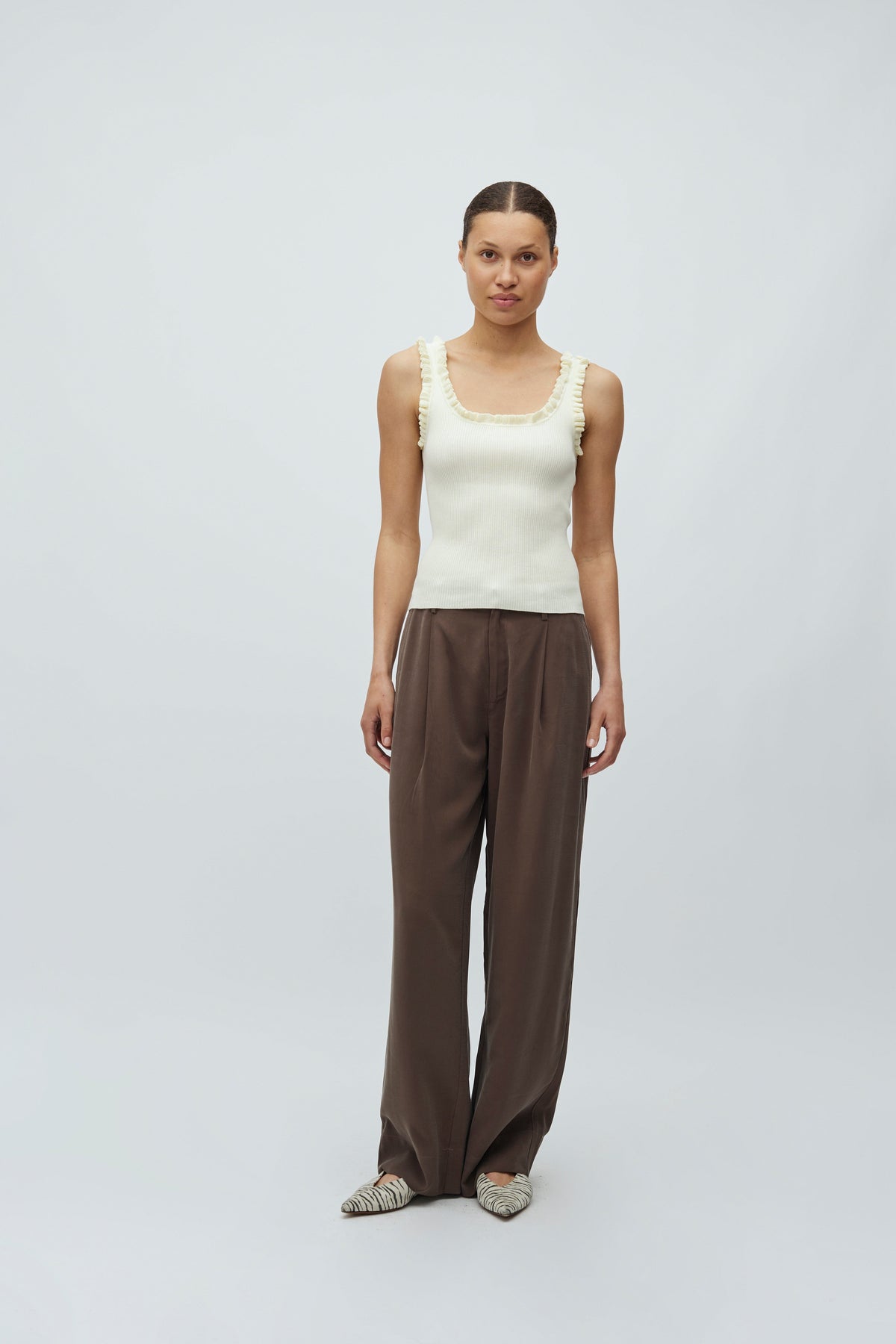 Ärmlose Top von MbyM in einem hellen, cremigen Gelbton. Das Top hat eine figurbetonte Passform mit Rüschen-Details entlang des eckigen Ausschnitts und der Träger.