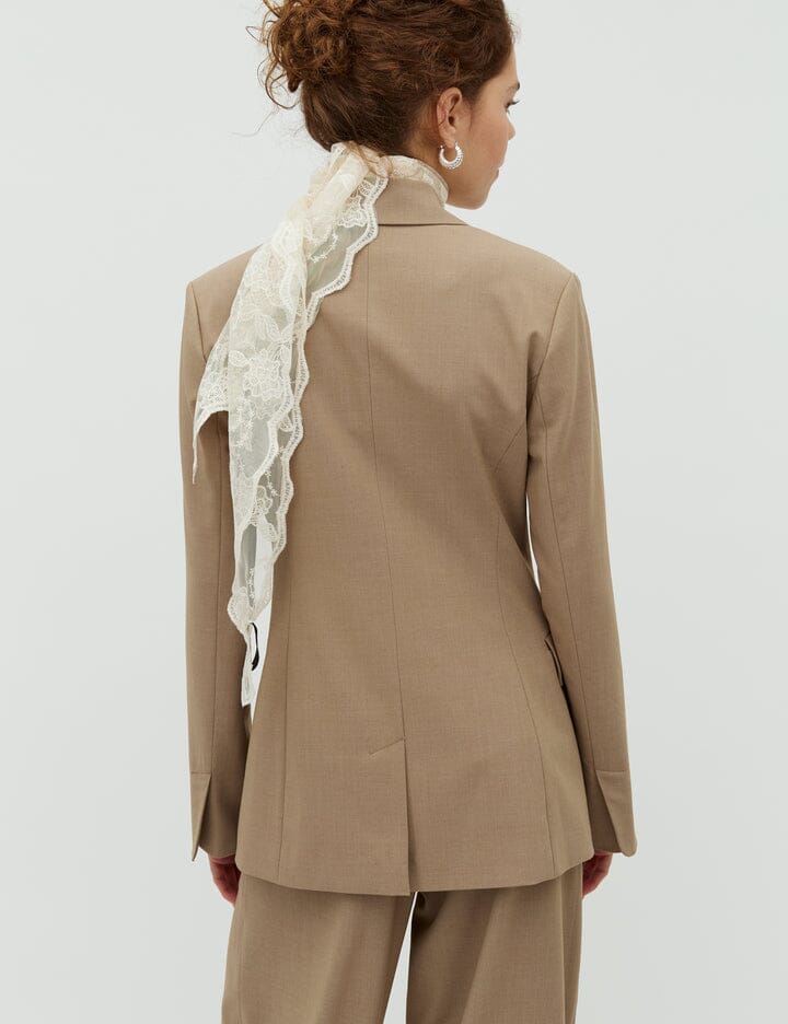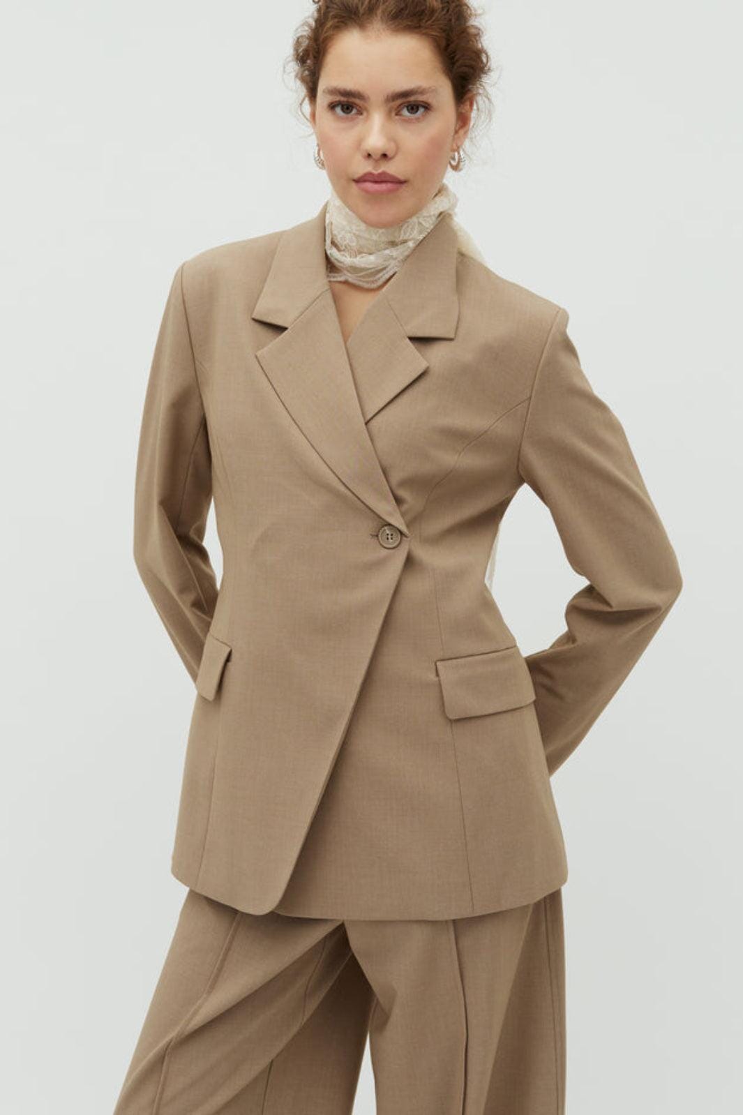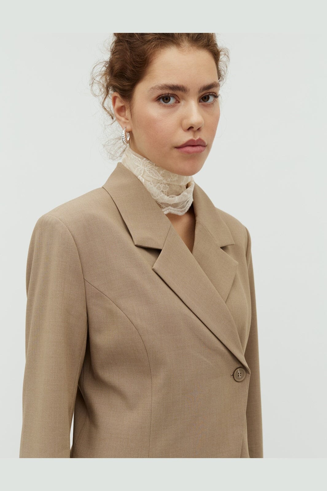 Blazer von MbyM in einem hellbraunen Melangeton. Der Blazer hat lange Ärmel, V-Ausschnitt und Knopfverschluss.