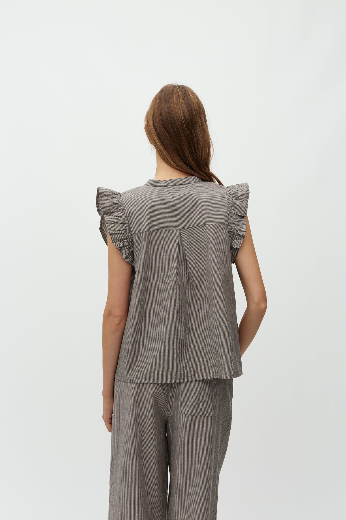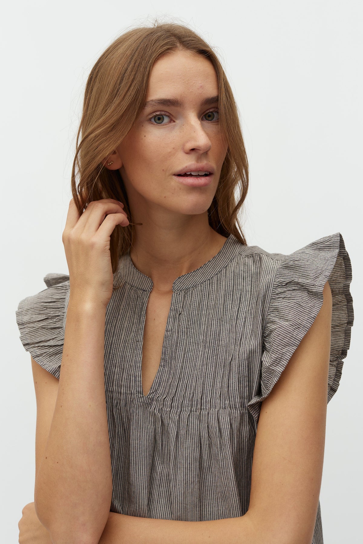Gestreiftes Top von MbyM in braunen und grauen Nuancen. Das Top hat Rüschen an den Ärmeln und dekorative Nähte im Stoff.