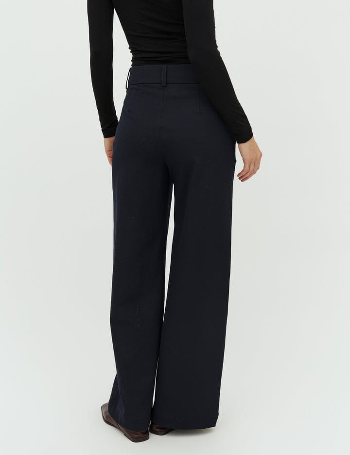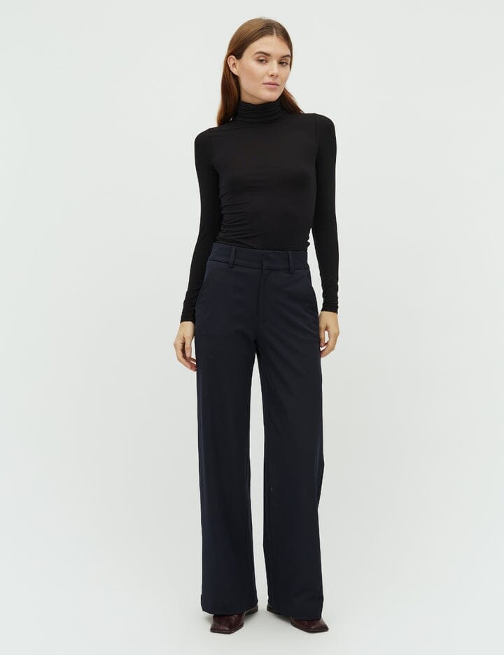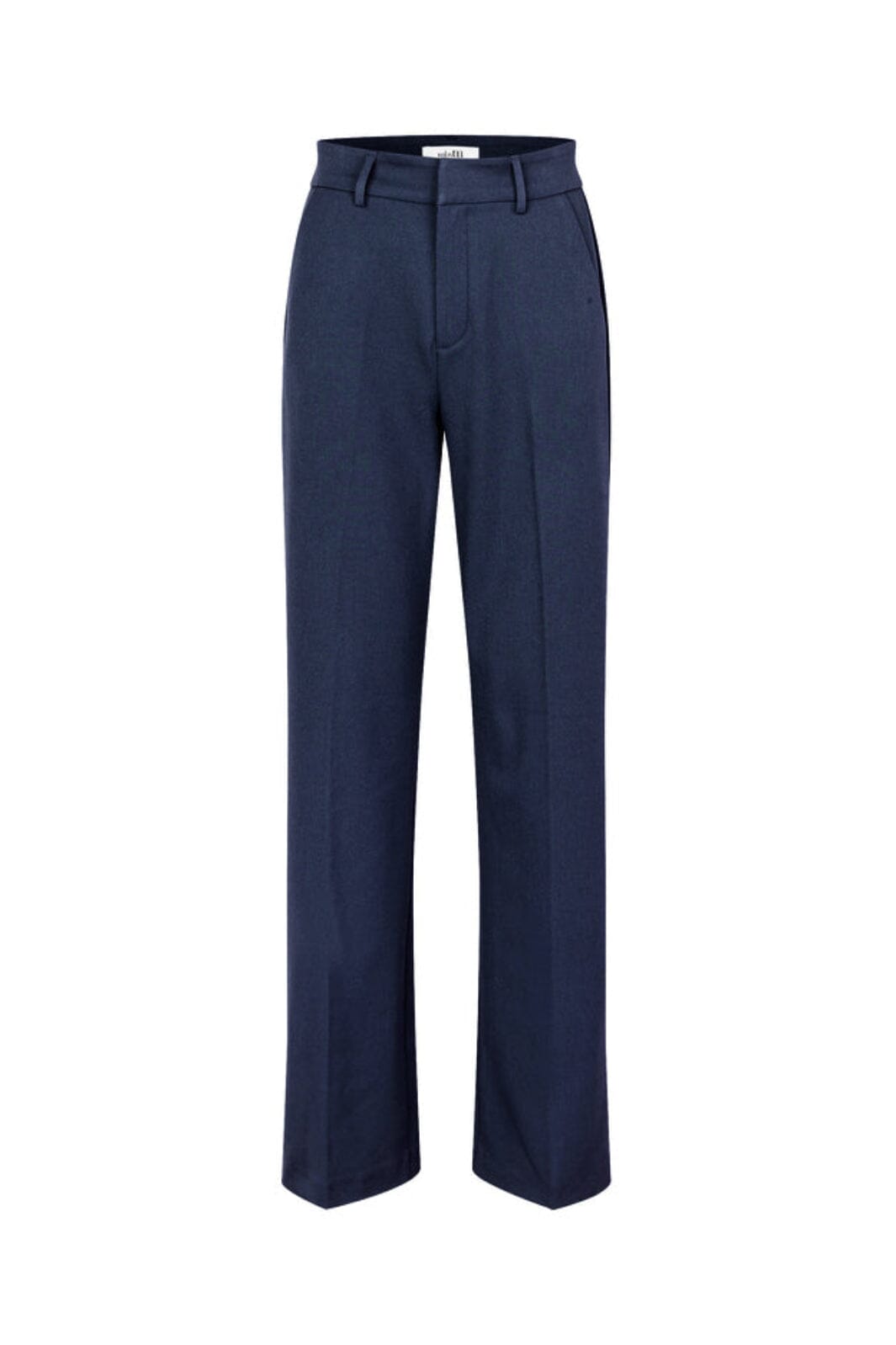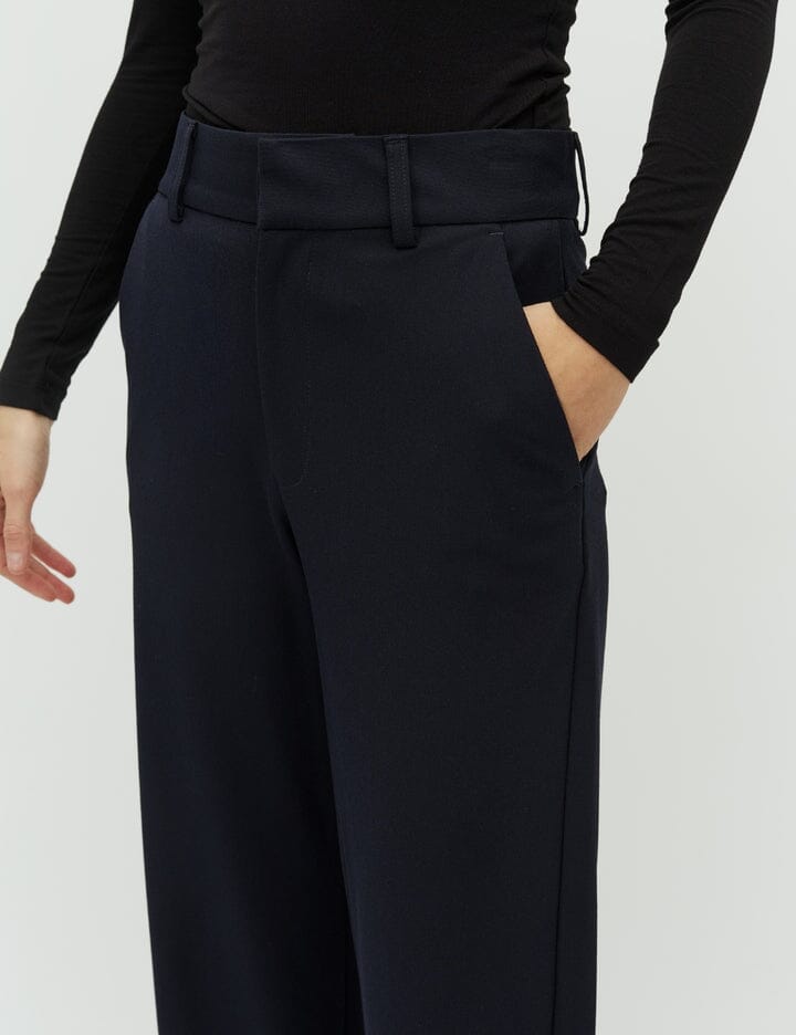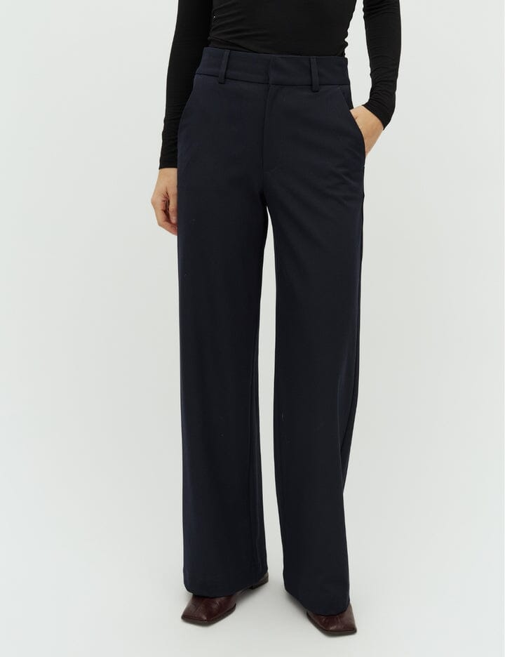 Dunkelblaue Hose von MbyM mit lockerer Passform und weitem Bein. Die Hose ist bodenlang und hat eine normale Leibhöhe mit Gürtelschlaufen.