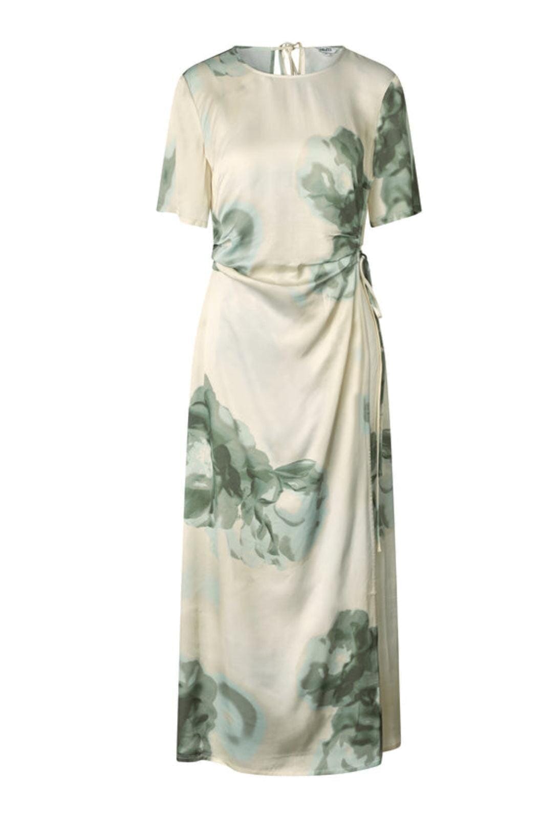 Kleid von MbyM, aus 100 % Viskose mit einem floralen Muster in Creme-, Weiß- und Grüntönen.