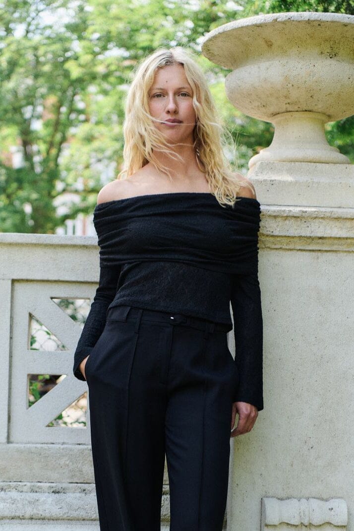 Schwarze Off-Shoulder-Bluse von MbyM mit floraler Spitze und Rüschen. Die Bluse hat eine schmale Passform und lange Ärmel.