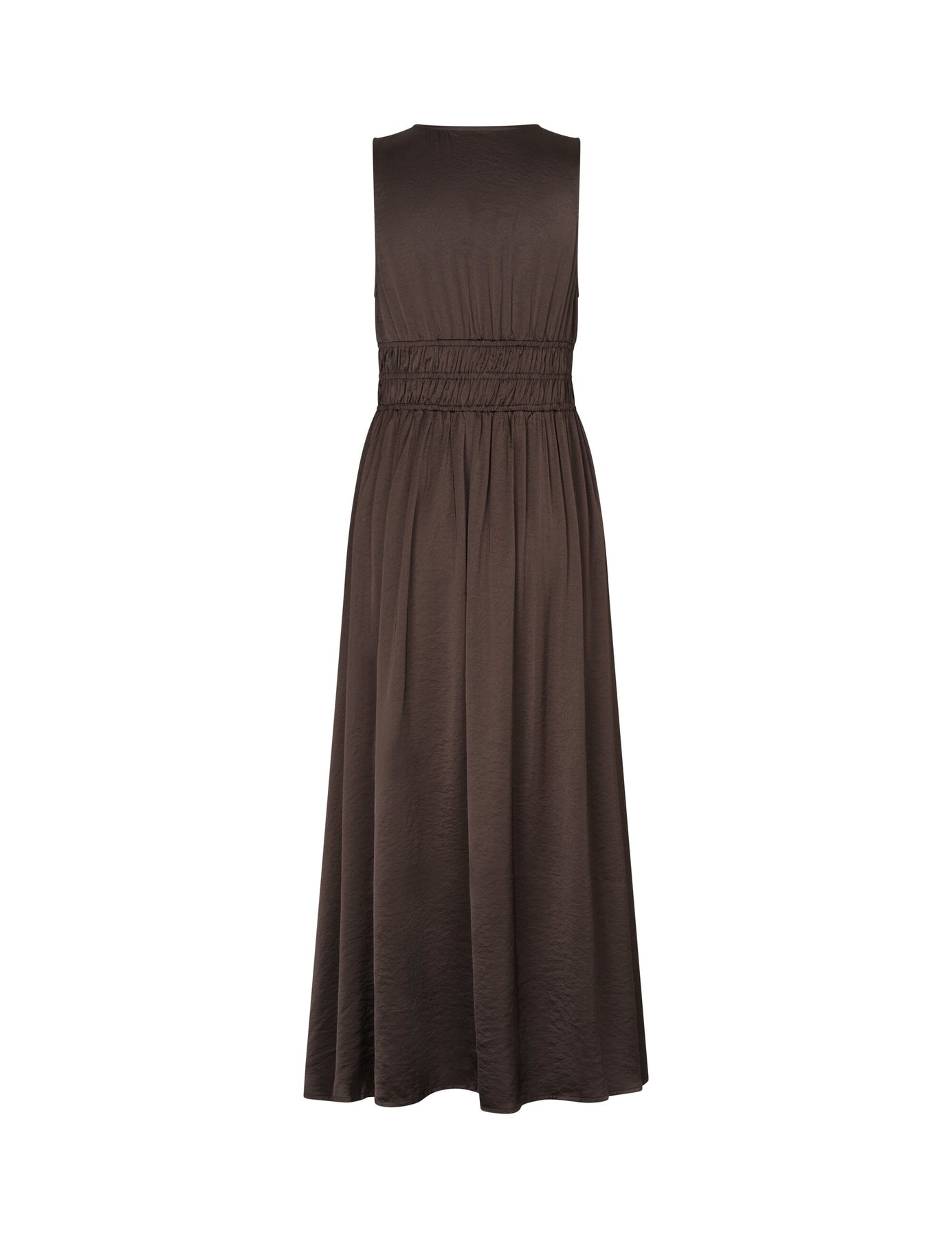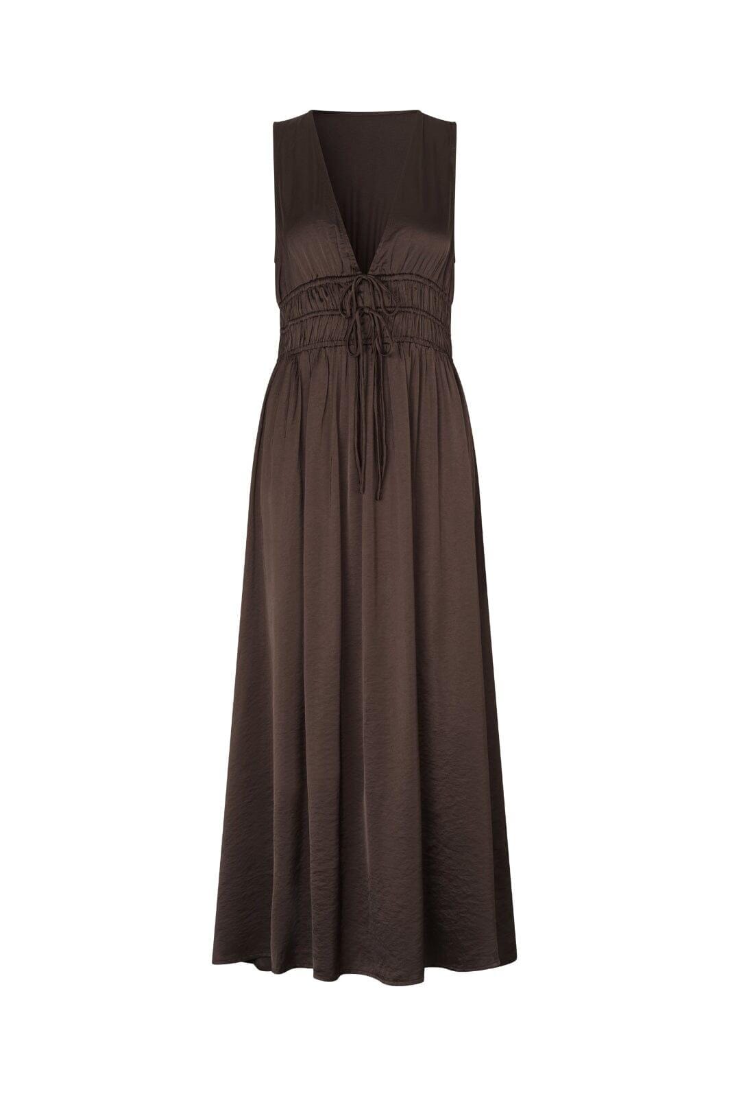 Braunes Kleid von MbyM in der Farbe Java. Das Kleid ist ärmellos mit V-Ausschnitt und reicht bis zur Mitte der Wade.