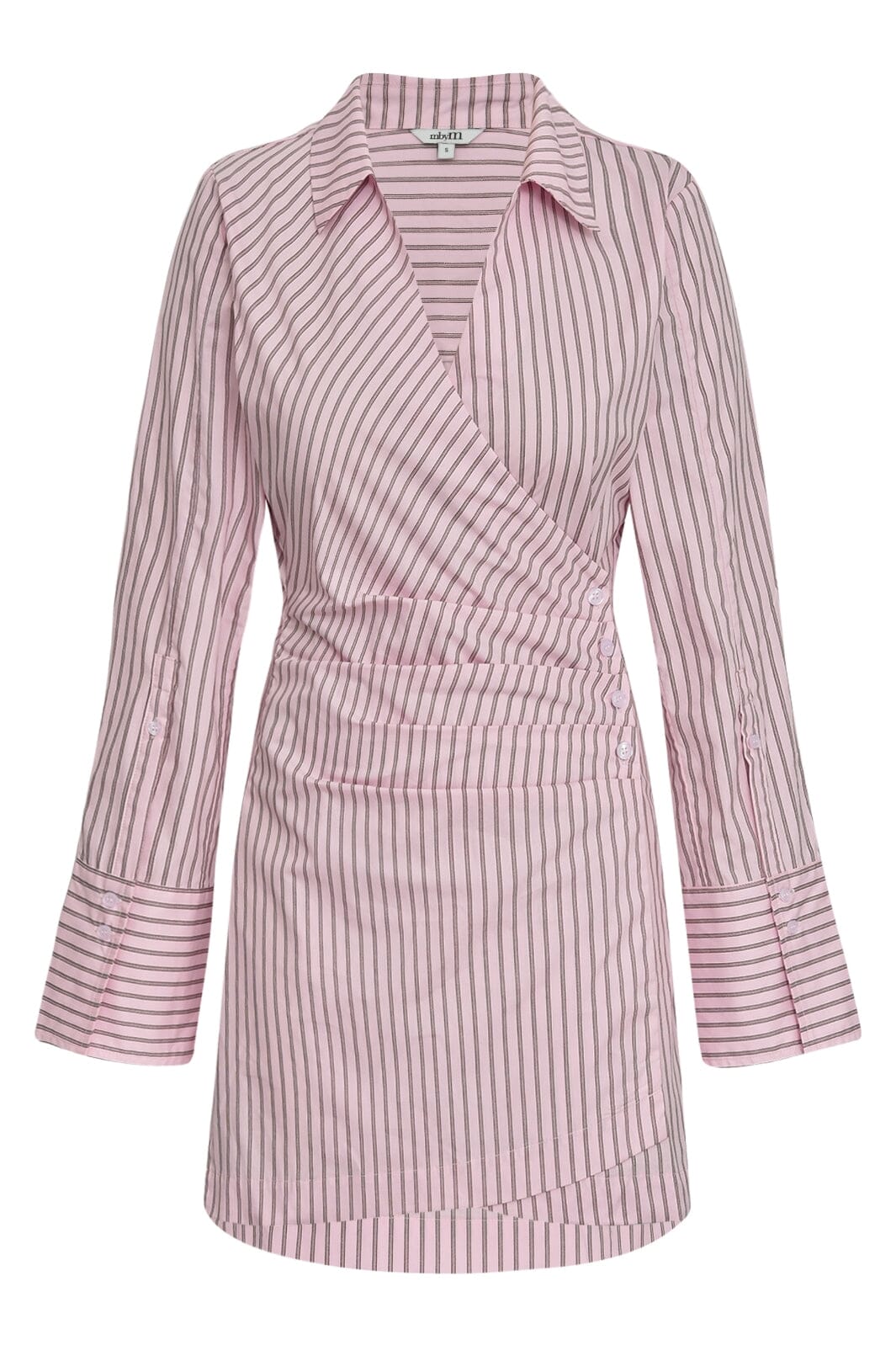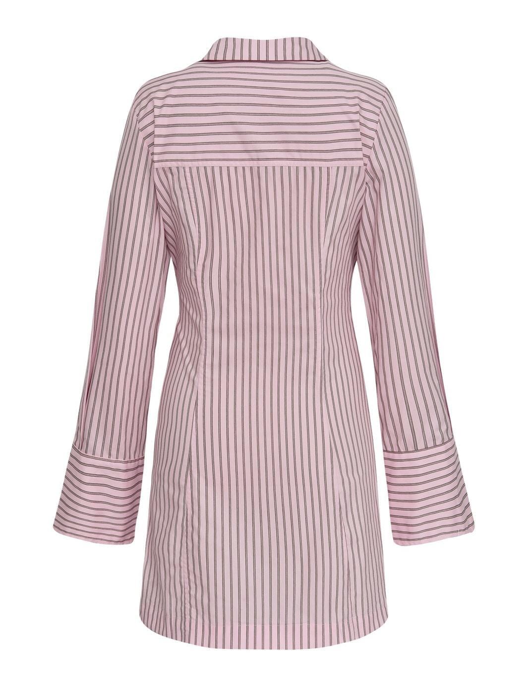 Rosa gestreifte Bluse von MbyM mit Hemdkragen und langen Ärmeln. Die Bluse hat Rüschen an den Manschetten und vertikale Streifen in hellrosa und dunkleren Nuancen.