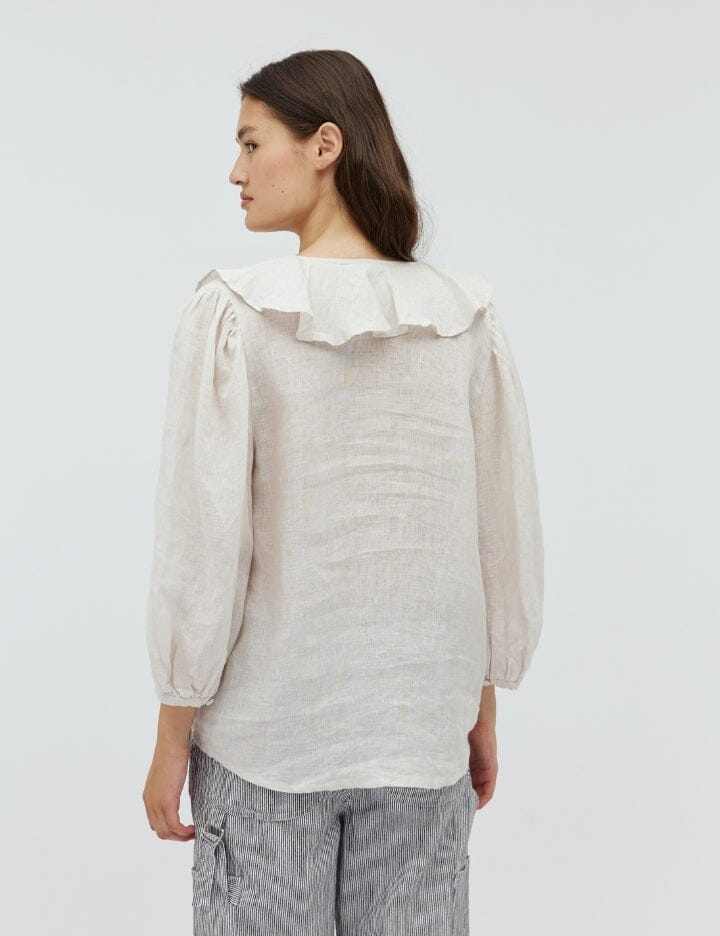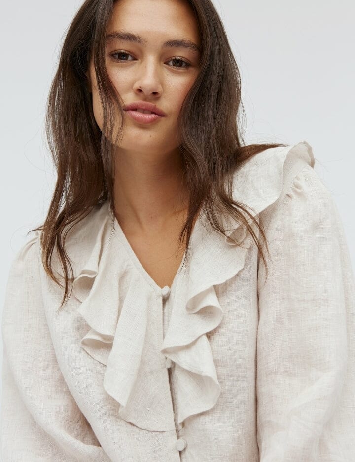 Bluse von MbyM in grauer Sandfarbe. Entworfen mit Knöpfen vorne und Rüschendetails am V-Ausschnitt. Die puffigen 3/4-Ärmel enden mit einem engen Manschette.