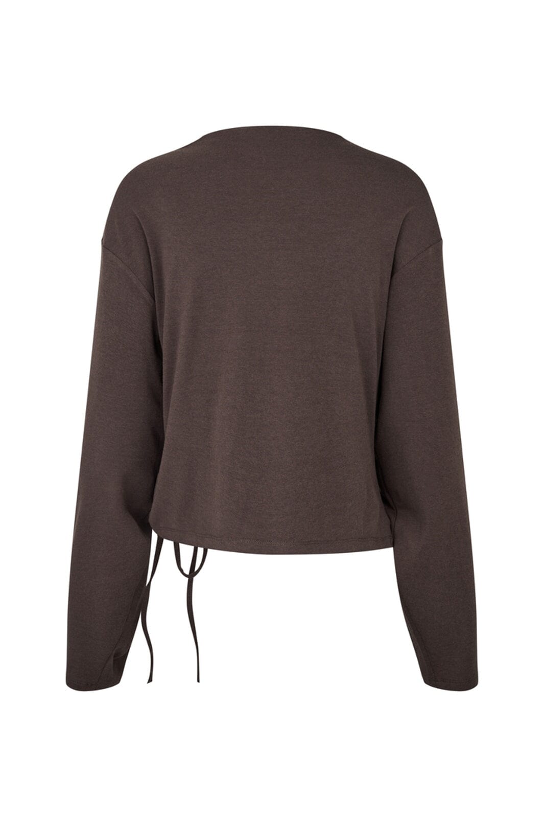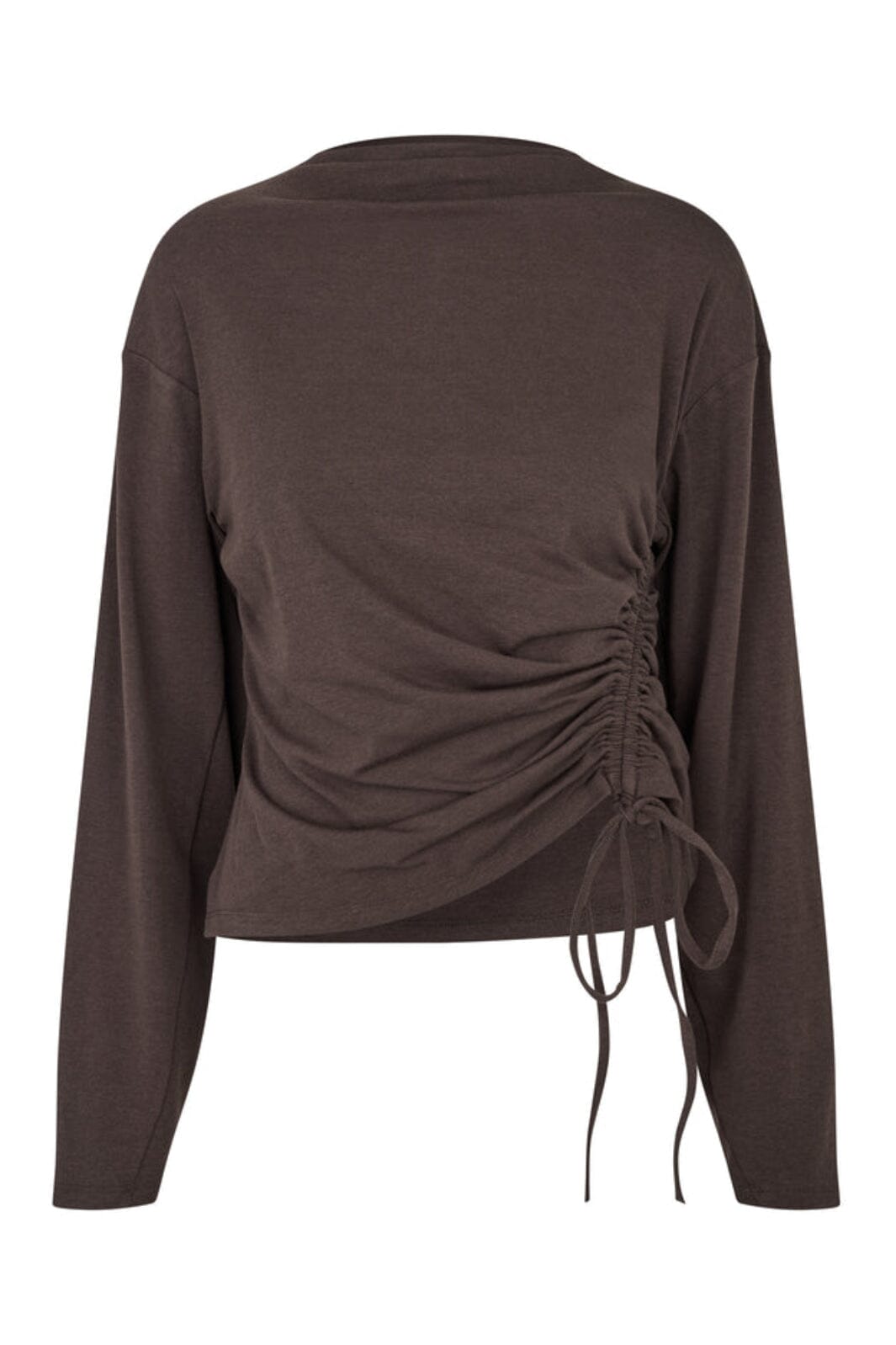 Dunkelbraunes Langarmtop von MbyM mit asymmetrischem gerafftem Detail an der Seite. Das Top hat verstellbare Kordeln und einen Rundhalsausschnitt.