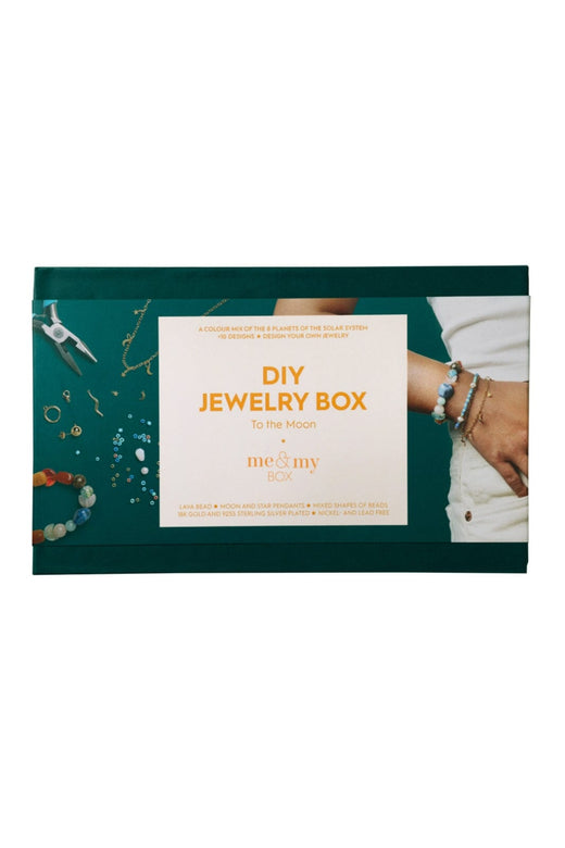 Grüne Schmuckbox von Me & My Box mit Perlen und Anhängern im Weltraumthema. Enthält Perlen in Planetenfarben, Mond- und Sternanhänger sowie eine große Lavasteinperle für kreative Schmuckdesigns.