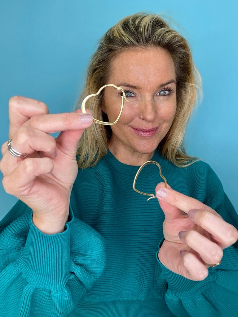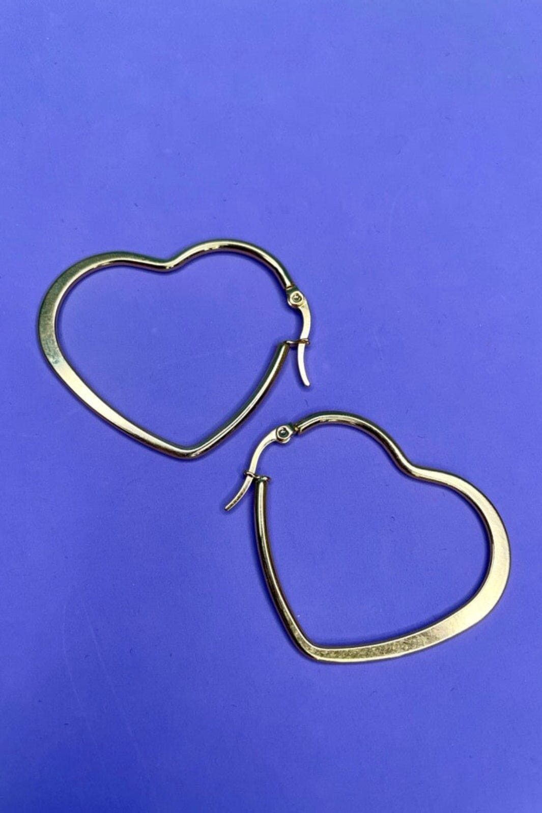 Herzförmige Ohrringe von Mellow Moon aus vergoldetem Messing. Die Schmuckstücke sind nickel- und bleifrei, was sie für empfindliche Haut geeignet macht.