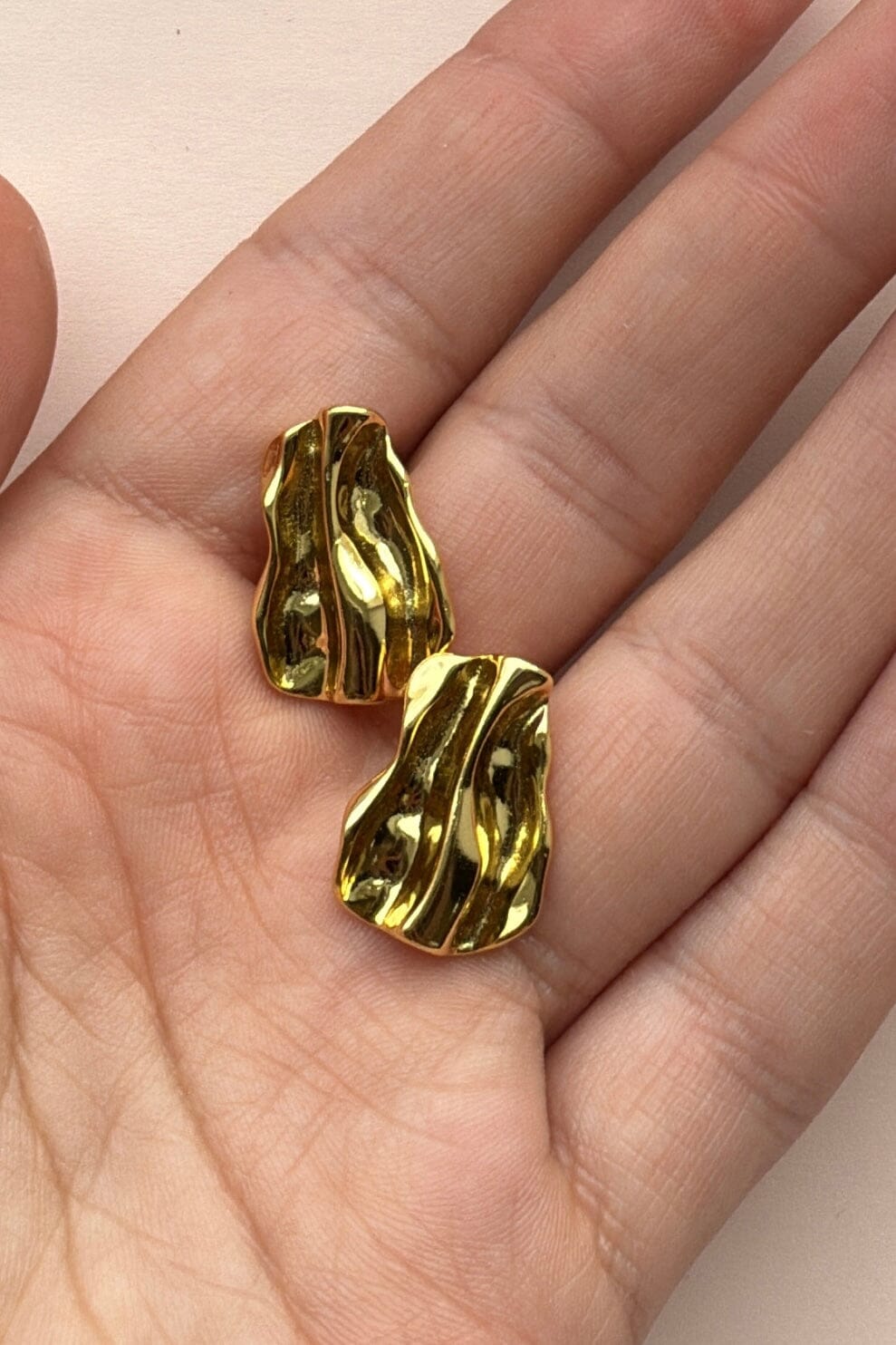 Vergoldete Ohrringe von Mellow Moon mit einer welligen Oberfläche. Die Ohrringe bestehen aus Sterlingsilber mit einer 18-karätigen Vergoldung, die dem strukturierten Design einen goldenen Schimmer verleiht.