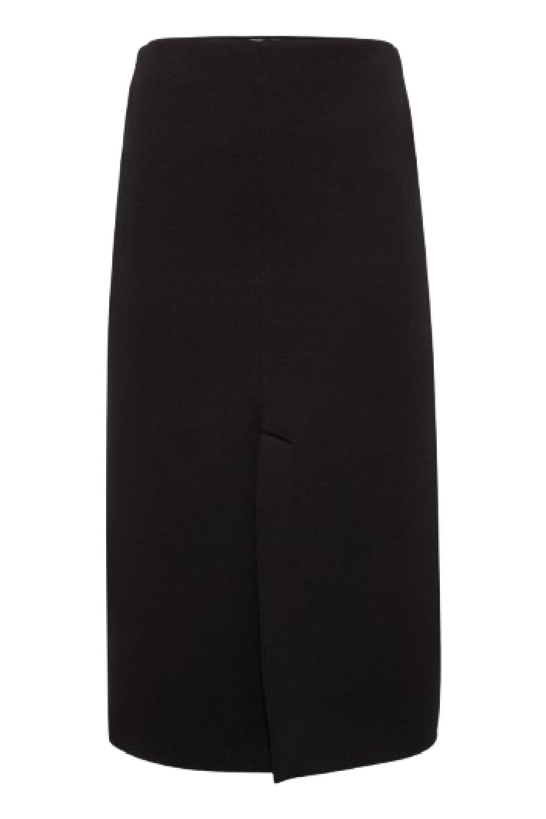 Schwarzer Rock von Moves By Minimum in knielanger Länge mit gerader Silhouette und Schlitz vorne. Der schlichte Stil eignet sich sowohl für das Büro als auch für festliche Anlässe.