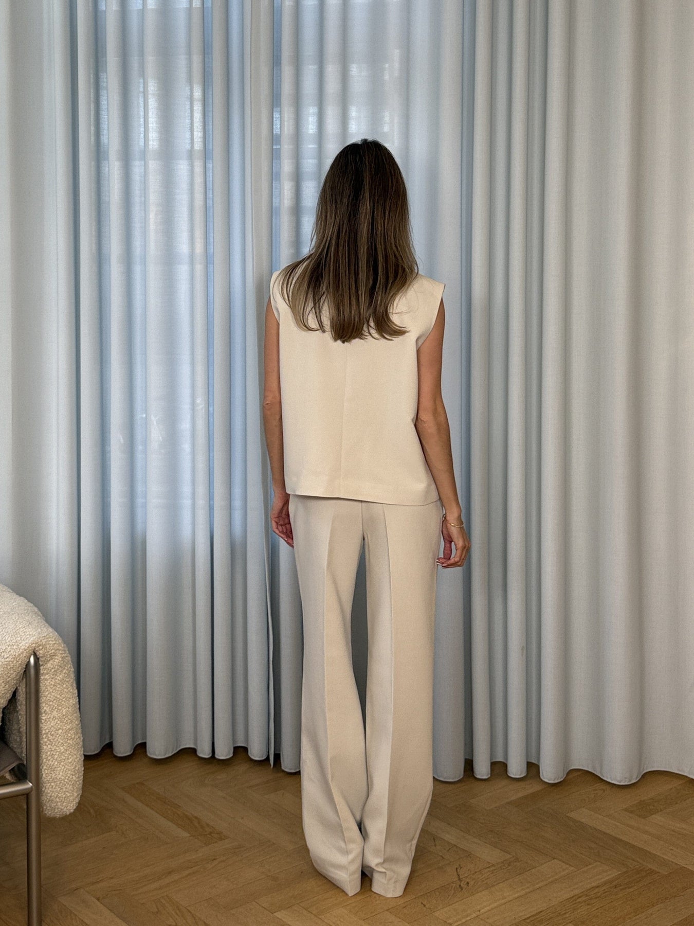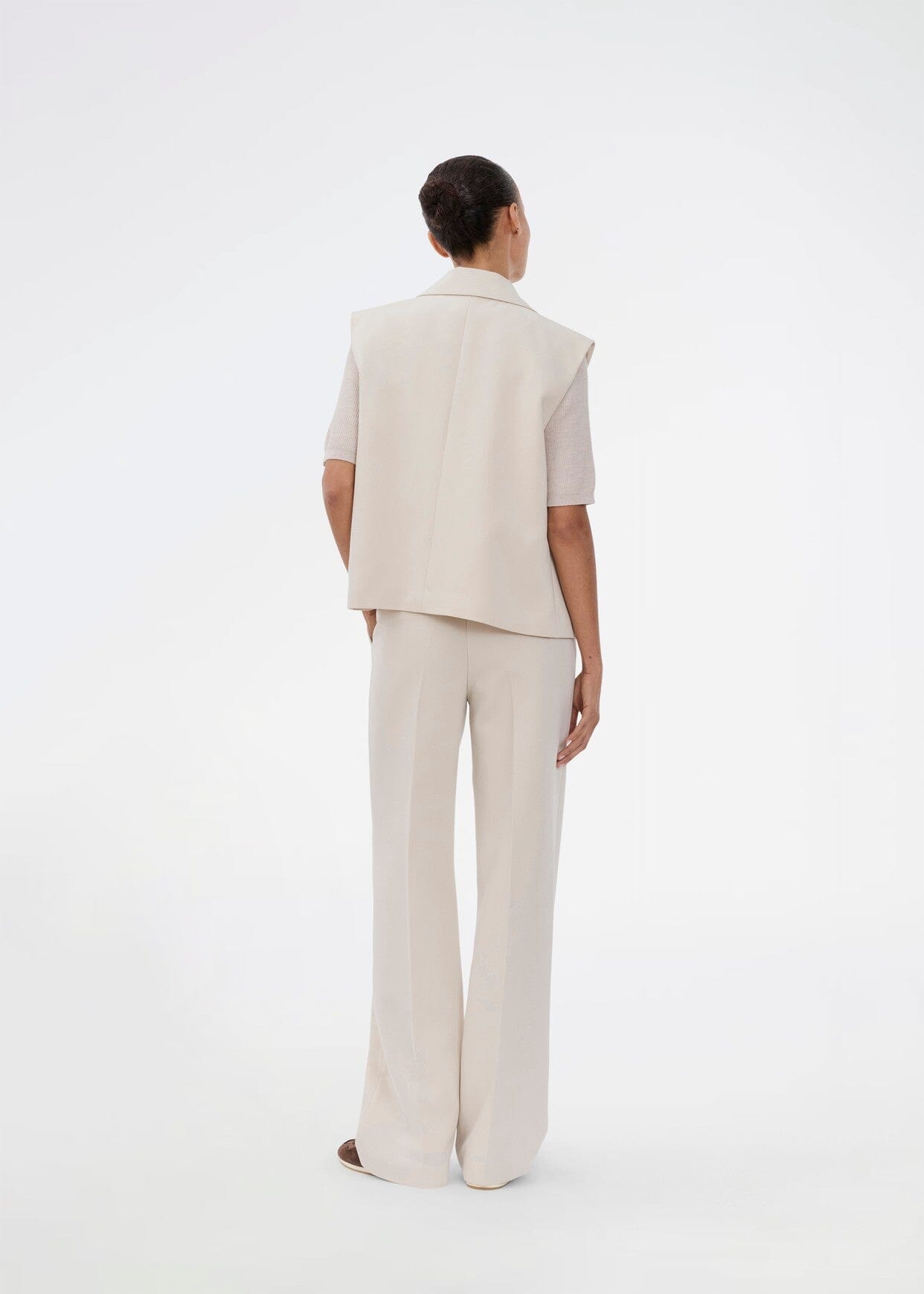 Ärmlose Weste von Modström in einem Off-White-Ton. Die Weste hat einen klassischen Kragen und wird vorne mit Knöpfen geschlossen.