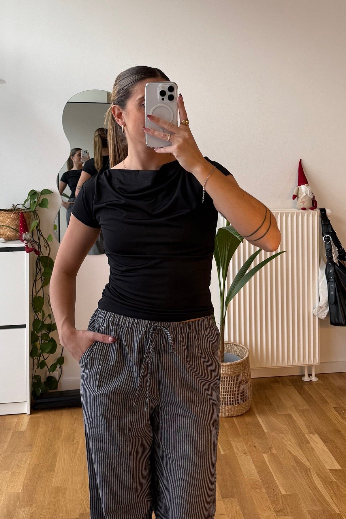 Schwarzes T-Shirt von Modström mit drapiertem Halsausschnitt. Das T-Shirt hat kurze Ärmel und eine figurbetonte Passform.