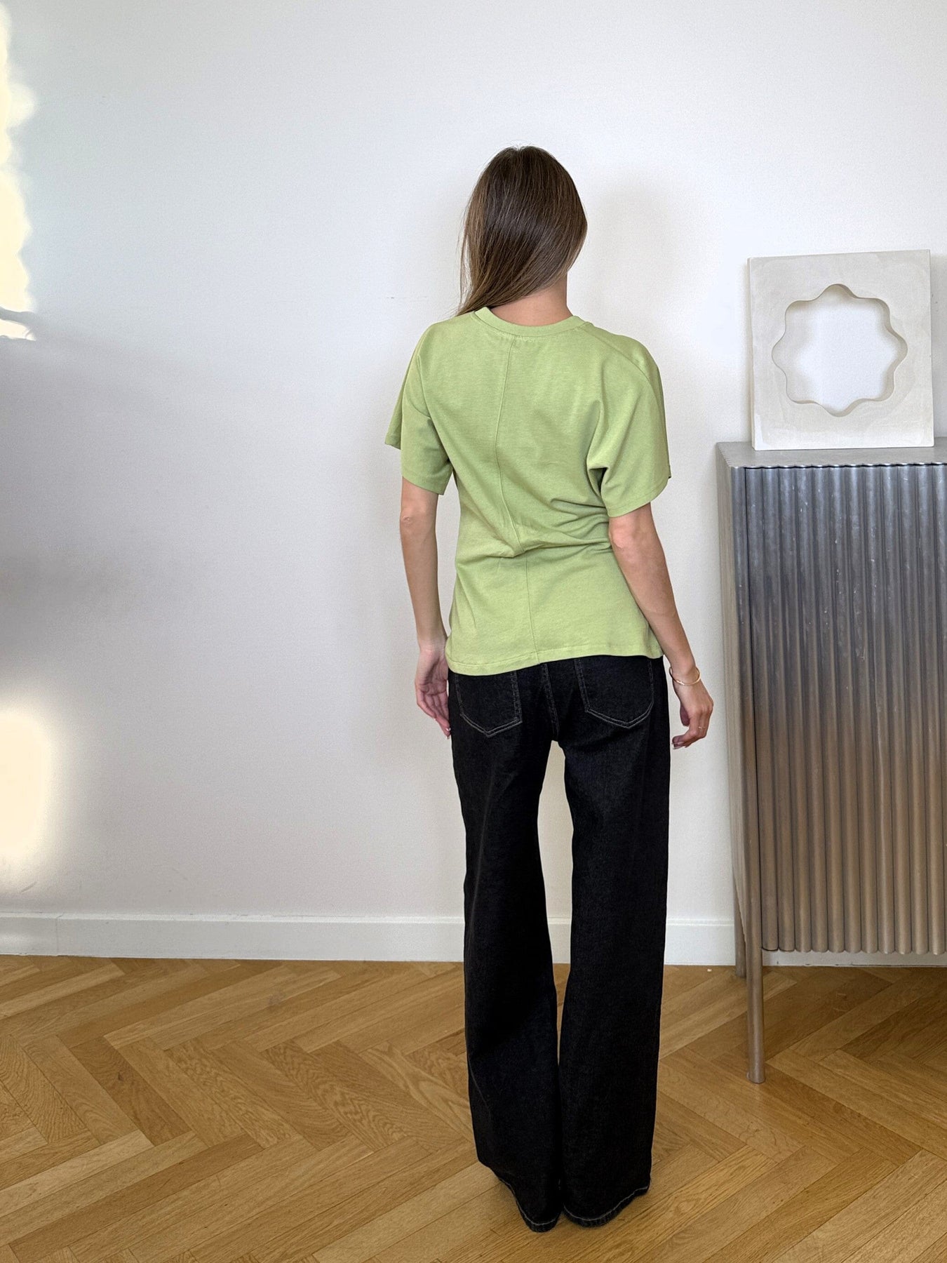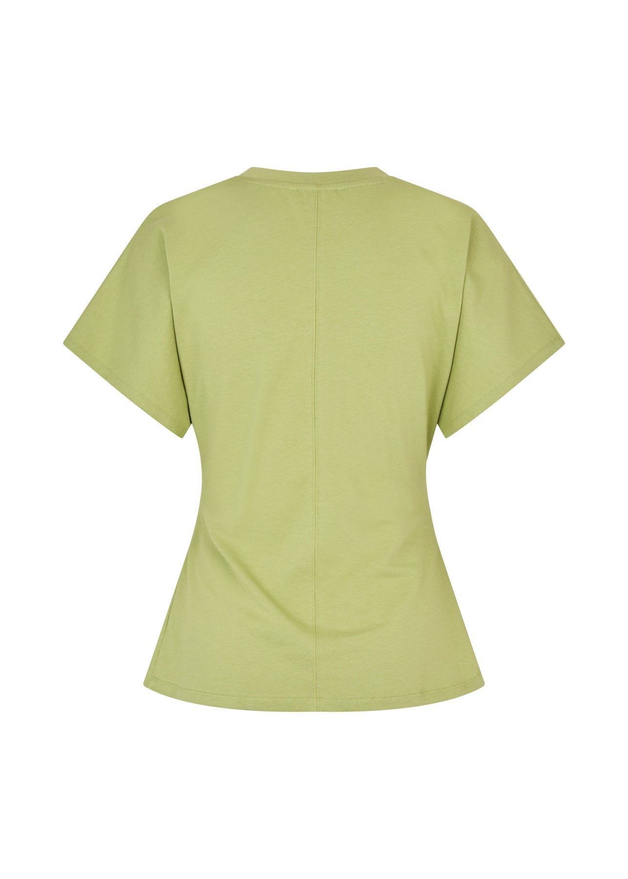 Hellgrünes T-Shirt von Modström mit dekorativen Nähten und Raffungdetails. Das T-Shirt hat eine figurbetonte Passform und kurze Ärmel.