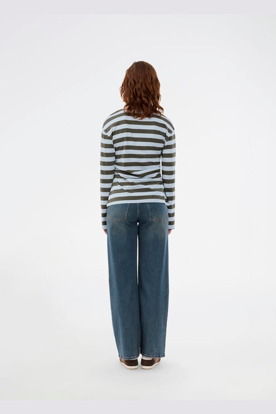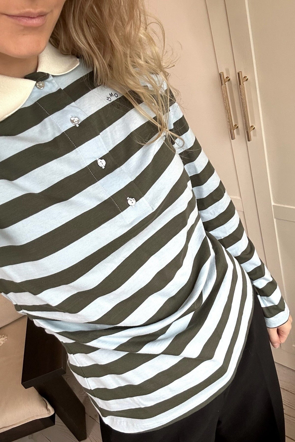 Langärmliges Polo von Modström aus Bio-Baumwolle. Entworfen mit horizontalen Streifen in hellblauen und dunkelgrünen Nuancen sowie einem weißen Polokragen mit Knopfverschluss.