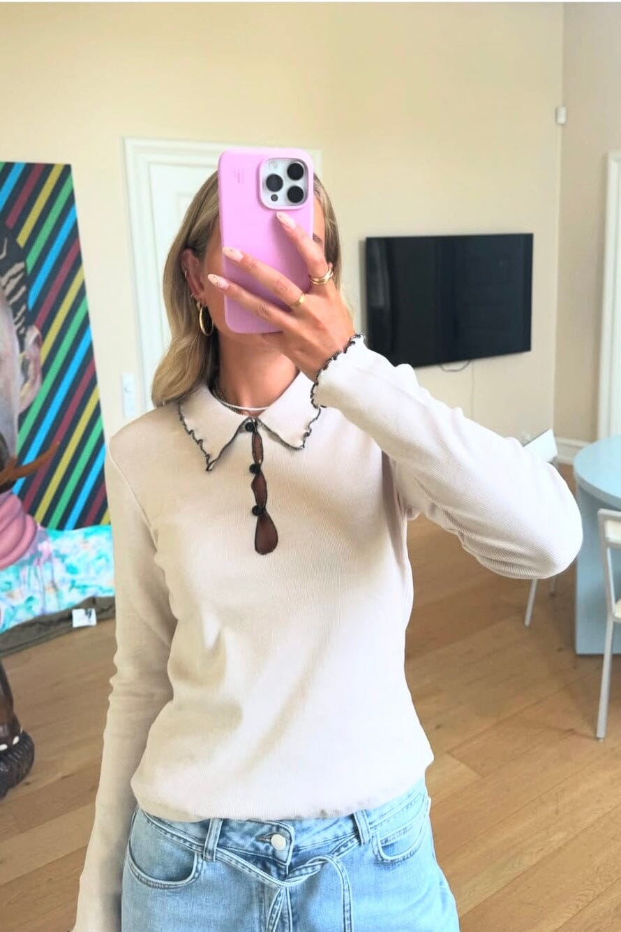 Ein Top von Modström in einem hellbeigen Farbton. Das Top hat einen Peter-Pan-Kragen mit welligem Rand in Kontrastfarbe und eine Knopfleiste vorn.