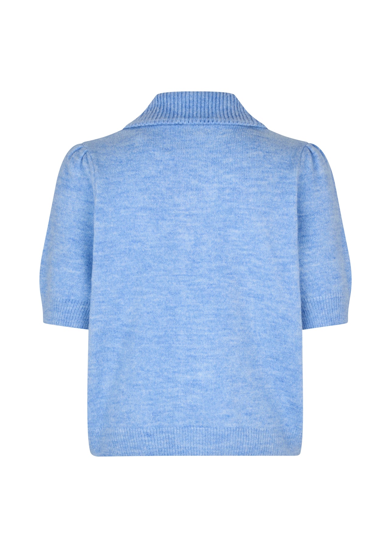 Hellblaue Strickjacke von Modström mit kurzen Ärmeln und Polokragen. Die Strickjacke hat eine Knopfleiste vorne und besteht aus einer Mischung aus Acryl und Polyester.