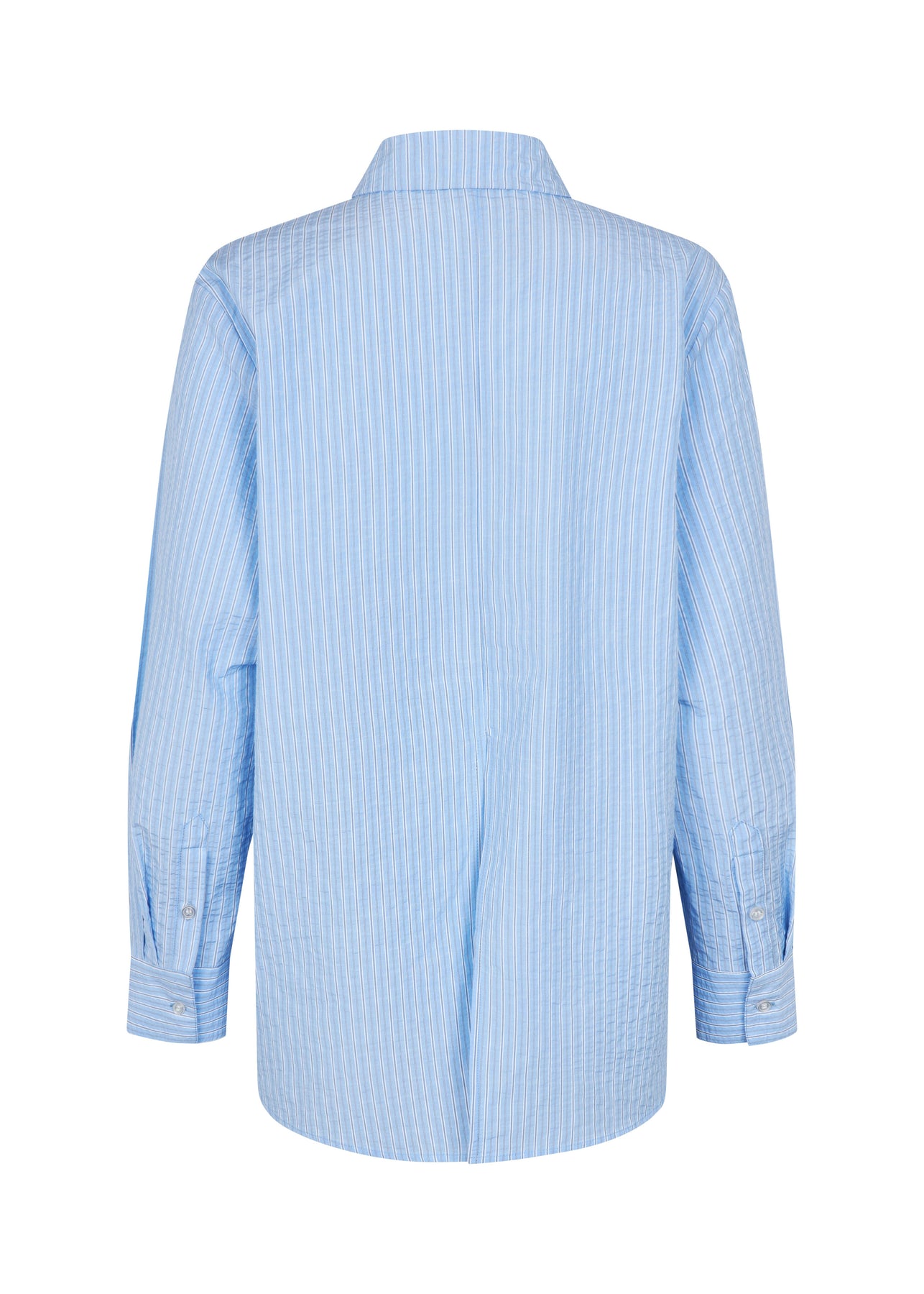 Gestreiftes Hemd von Modström in Blau und Weiß. Das Hemd hat eine oversized Passform und lange Ärmel mit Manschetten.