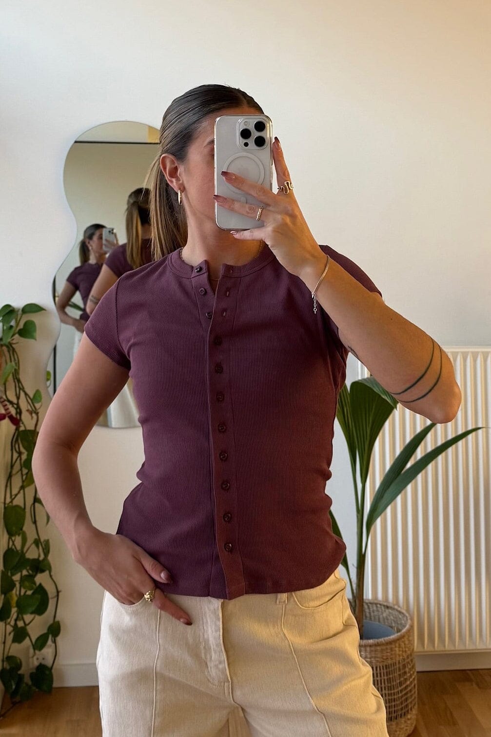 Figurbetontes T-Shirt von Modström in einem dunklen Rotton. Es hat eine Knopfleiste vorne und kurze Ärmel.