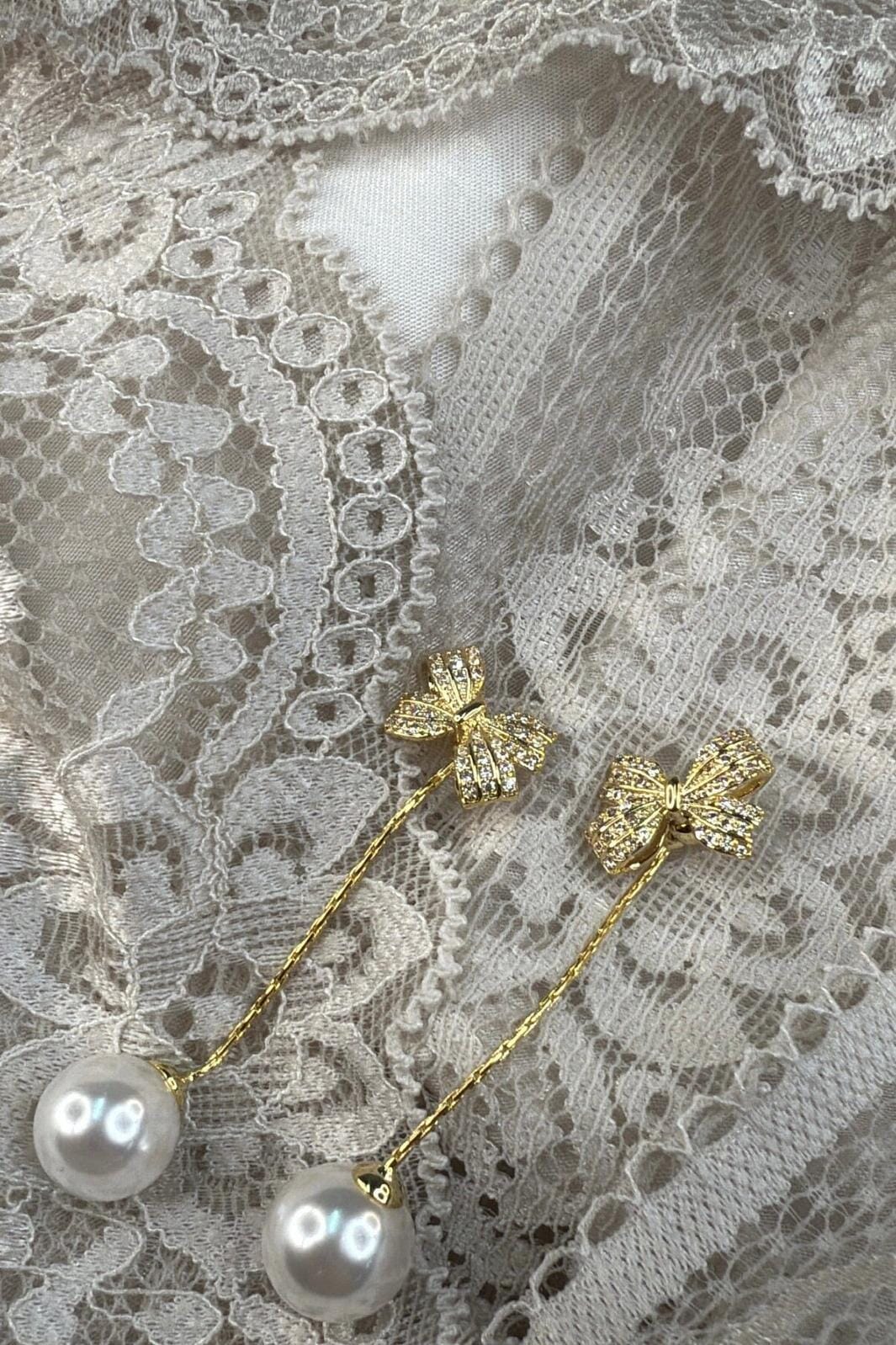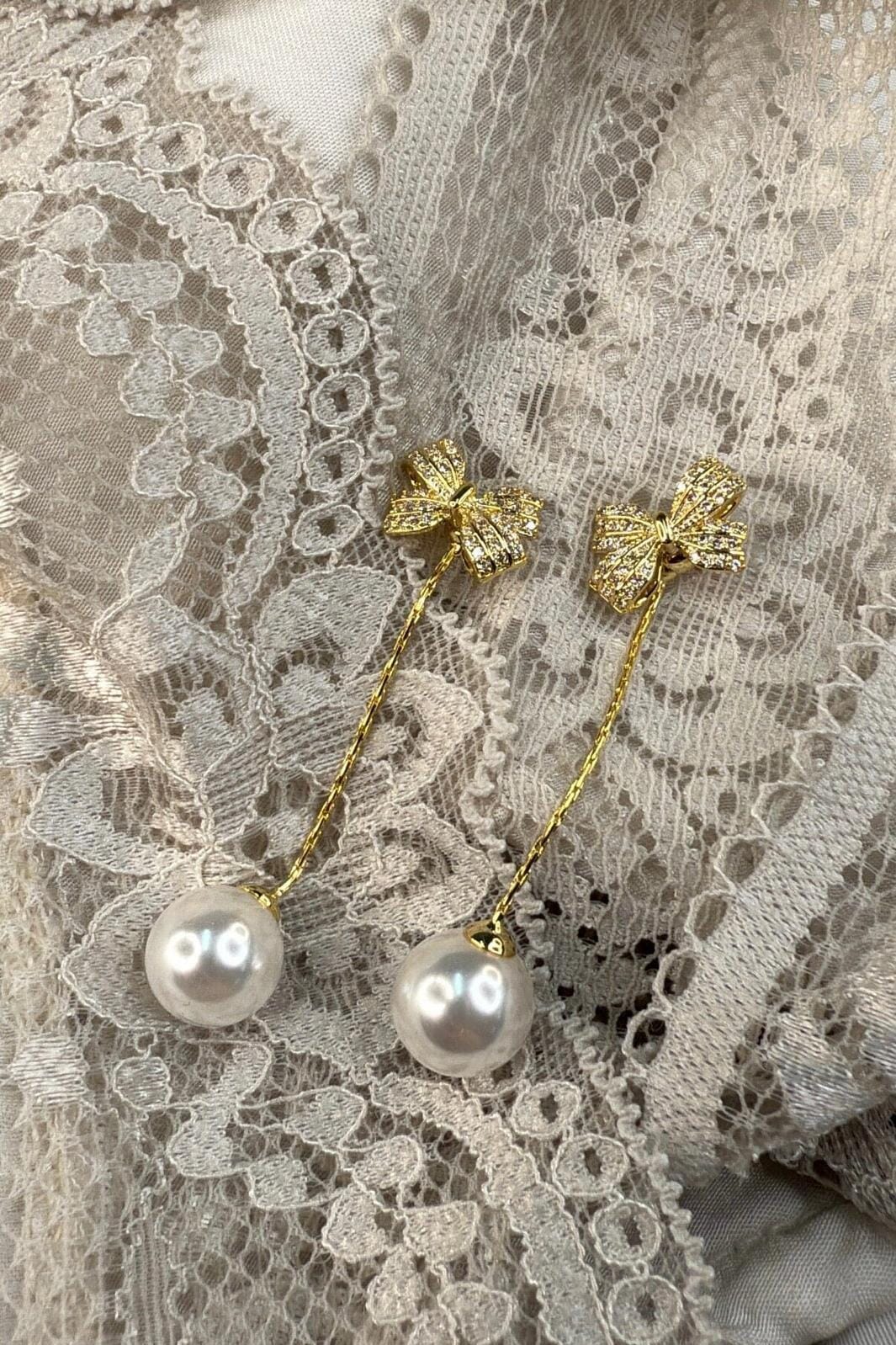 Ohrringe von Molly&My Jewellery mit einem schleifenförmigen Design. Jeder Ohrring hat kleine, funkelnde Steine auf der Schleife und eine runde Muschelperle.