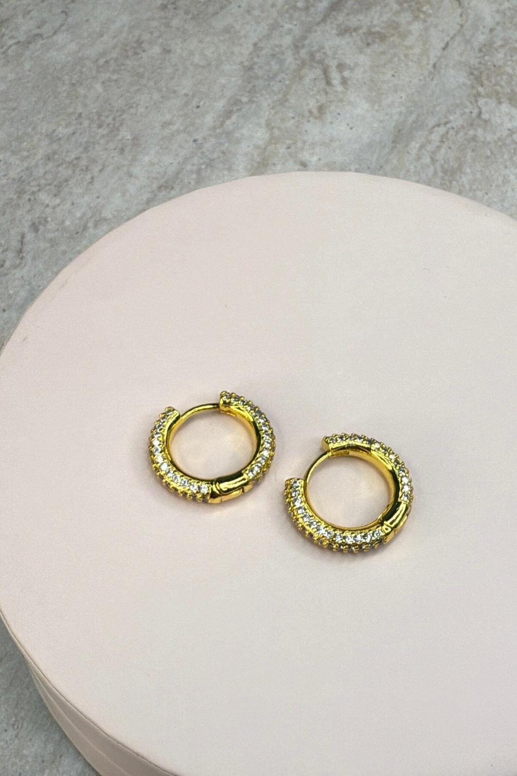 Runde Creolen von Molly&My Jewellery mit einer goldfarbenen Oberfläche. Die Ohrringe sind mit kleinen Steinen rund um die Außenseite verziert.