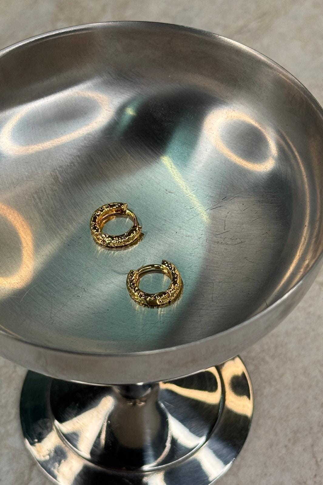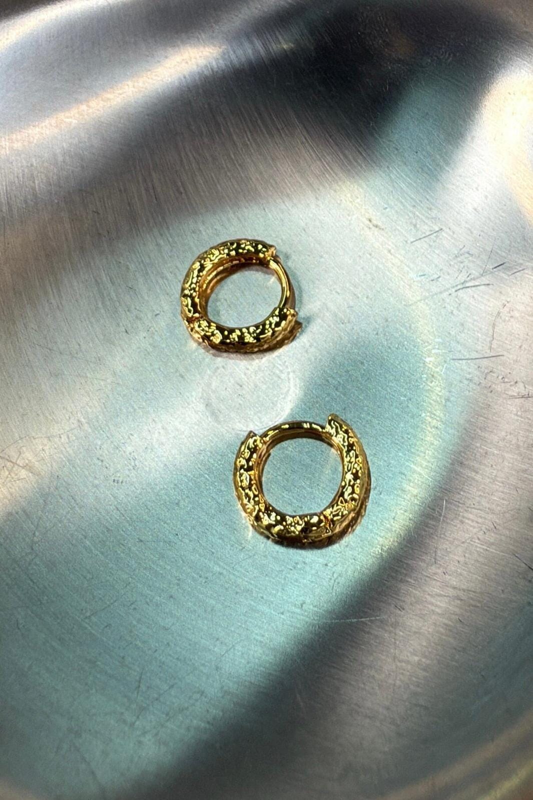 Goldfarbene Ohrringe von Molly&My Jewellery mit runder Form und strukturierter Oberfläche. Die Ohrringe sind vergoldet und haben einen Scharnittverschluss.