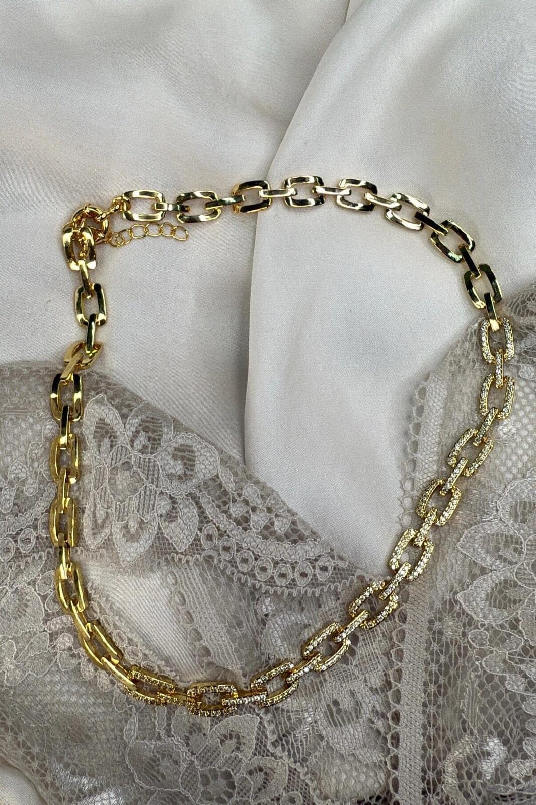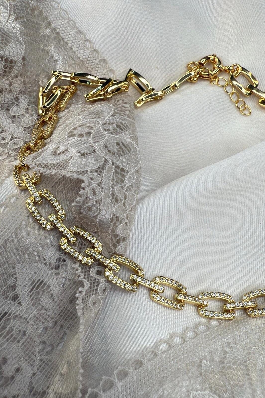 Vergoldete Halskette von Molly&My Jewellery mit rechteckigen Kettengliedern. Einige Glieder sind mit kleinen, glänzenden Steinen verziert. Die Kette hat einen verstellbaren Verschluss.