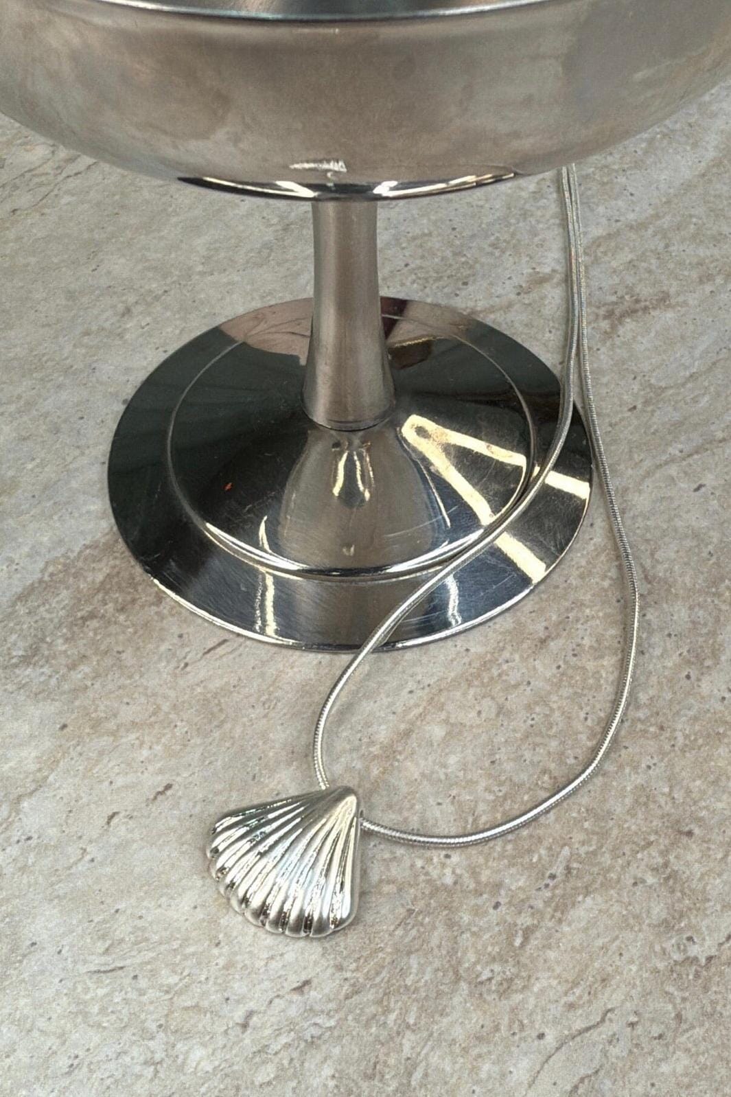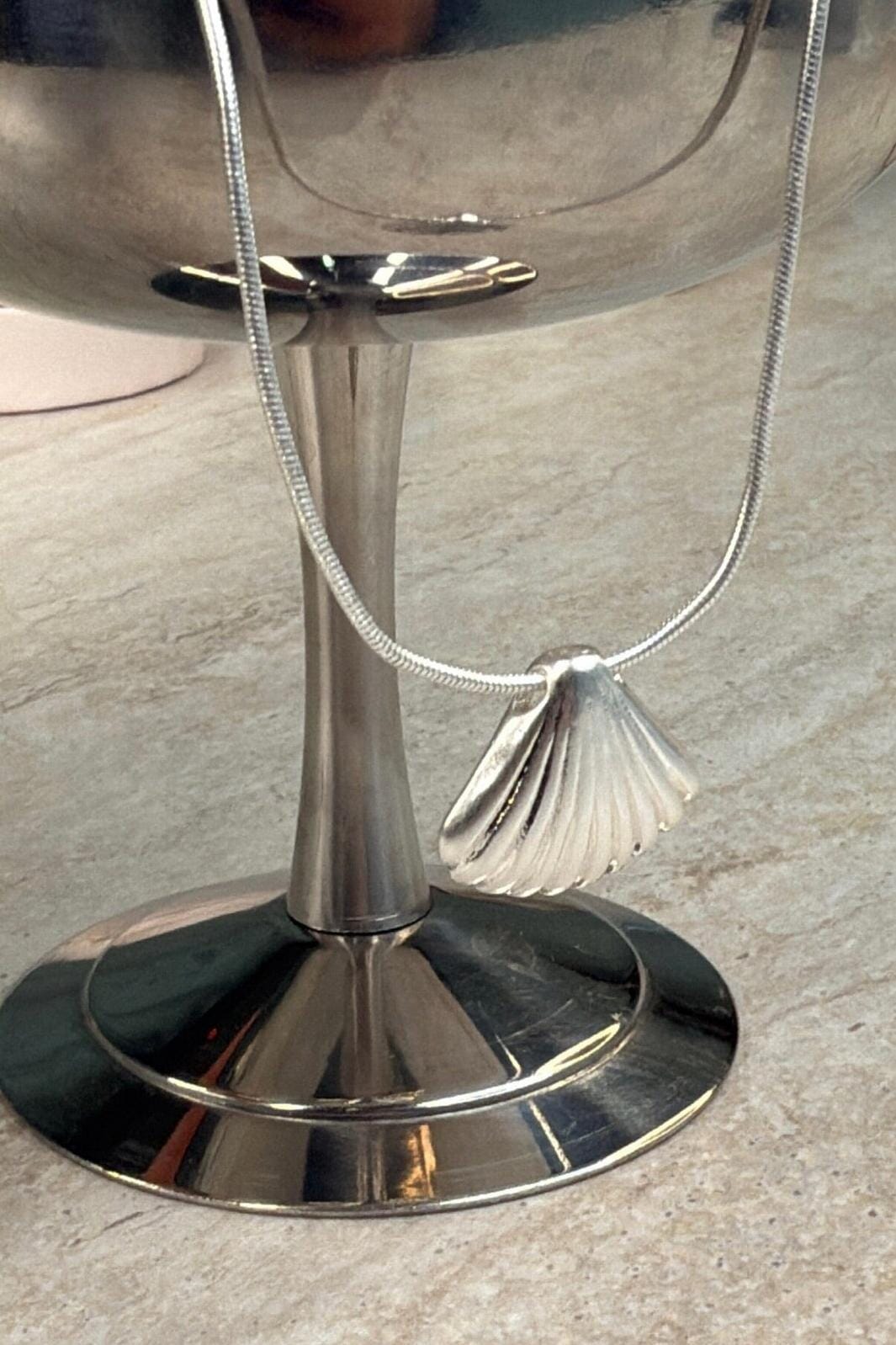 Versilberte Halskette von Molly&My Jewellery mit einem muschelförmigen Anhänger. Die Halskette hat eine Schlangen-Kette und eine gerillte Struktur am Anhänger.