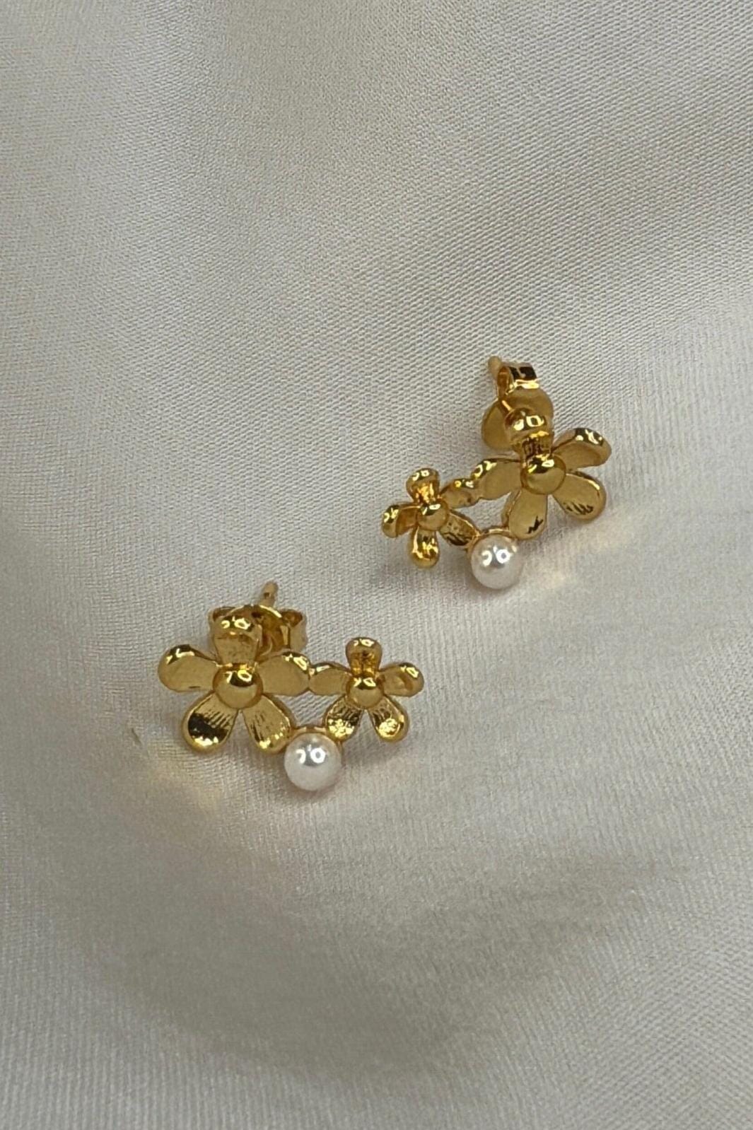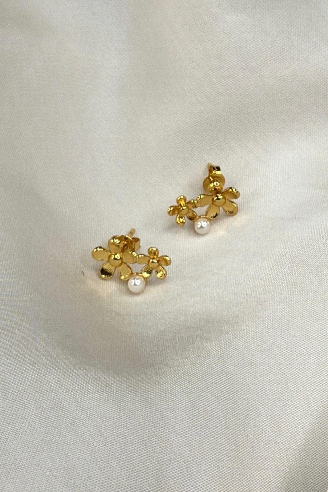 Vergoldete Ohrstecker von Molly&My Jewellery mit zwei kleinen Blumen in Gold und einer weißen Perle an jedem Ohrstecker.