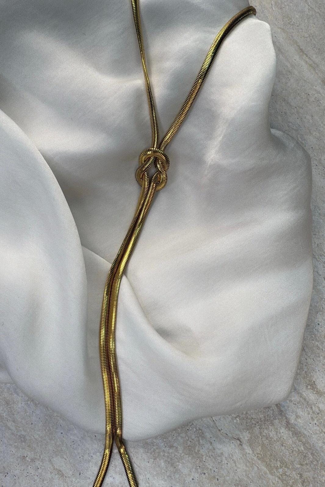Vergoldete Halskette von Molly&My Jewellery mit einem glatten, schlangenähnlichen Kettendesign und einem Knoten in der Mitte. Die Kette hat einen verstellbaren Verschluss.