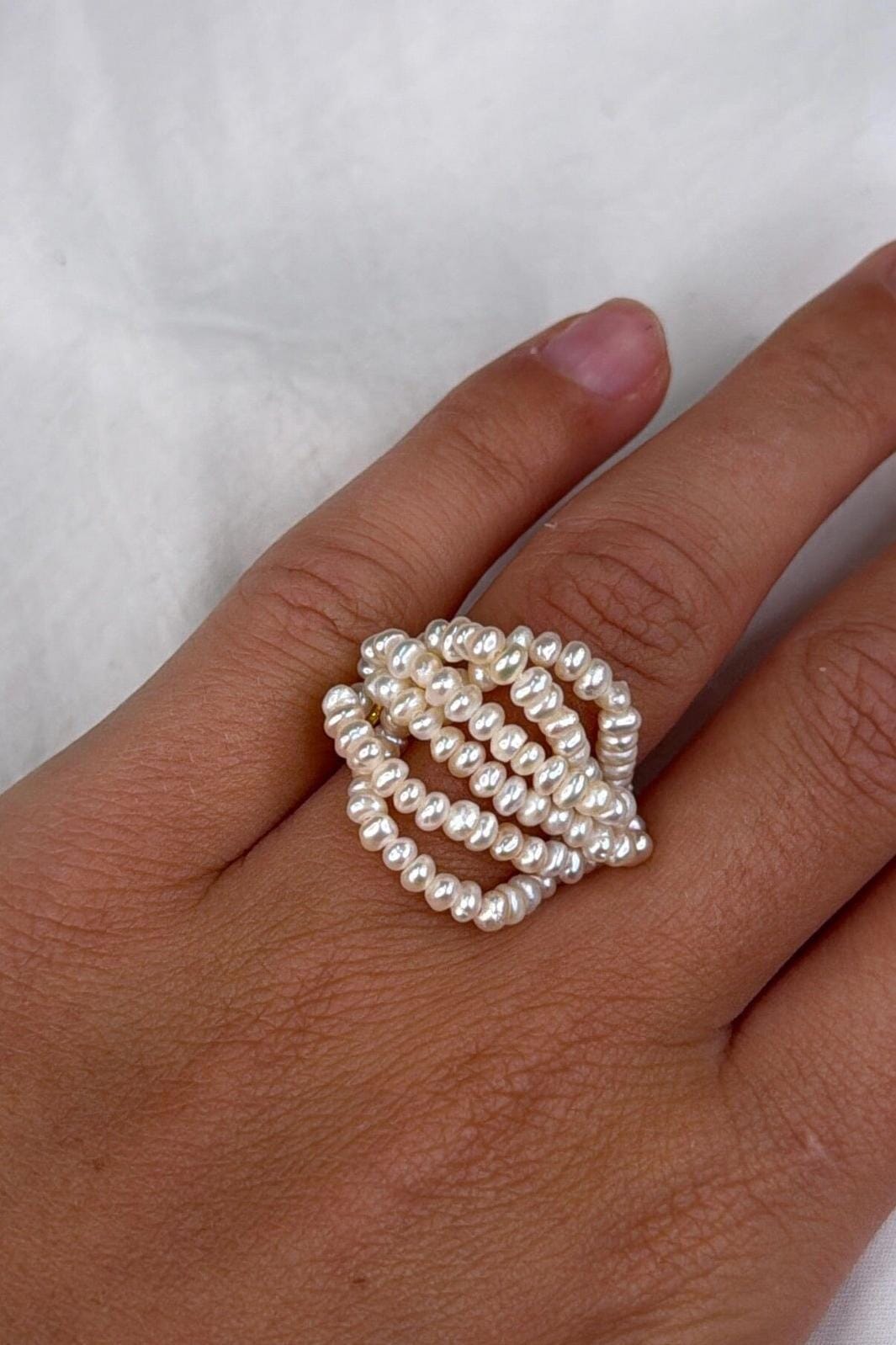 Vergoldeter Ring von Molly&My Jewellery mit einem spiralförmigen Design aus kleinen, perlenähnlichen Elementen, die einen großen Teil des Fingers bedecken.