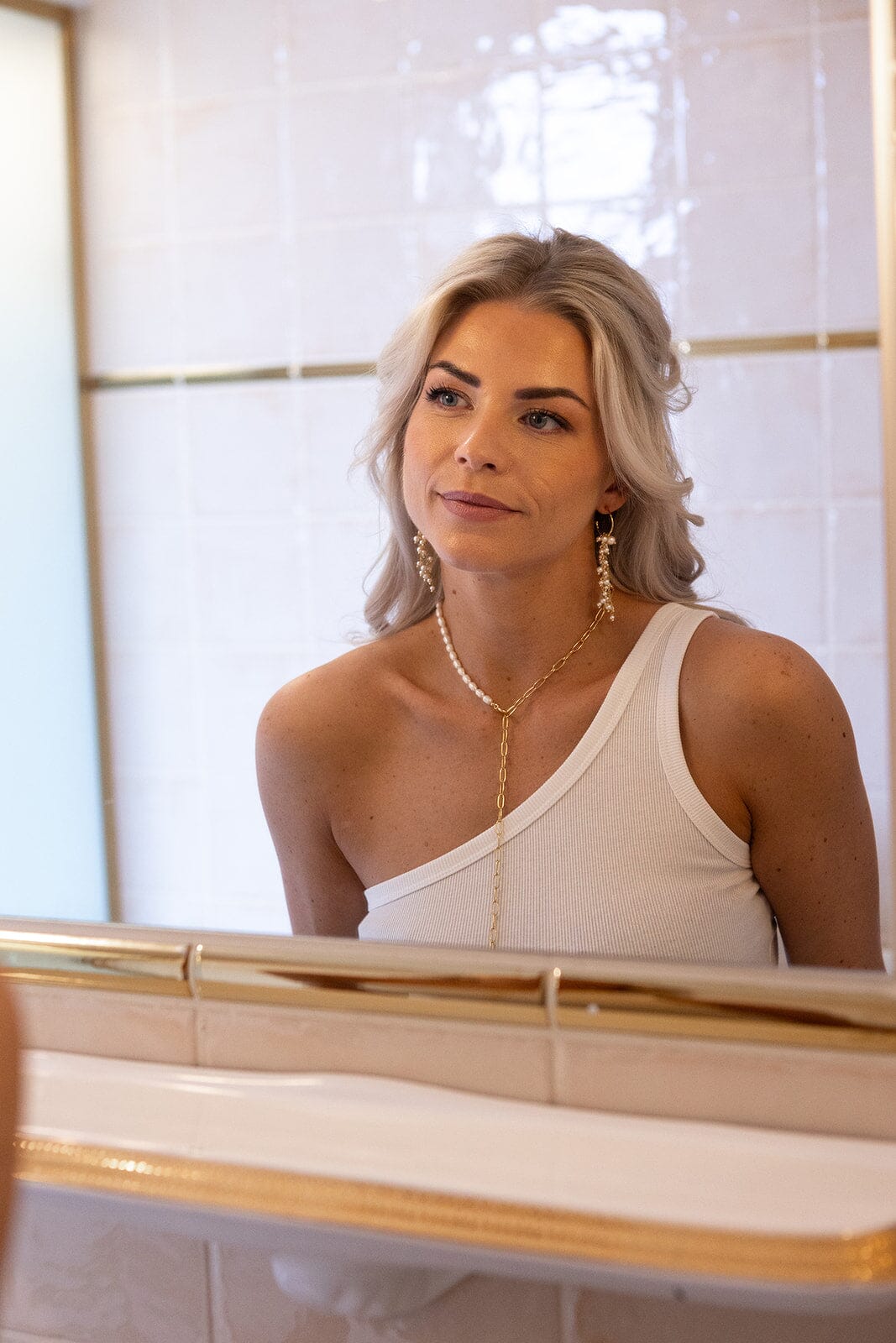 Weißes, geripptes Top von Molly & My X Melanie Due mit asymmetrischem Off-Shoulder-Design und einem einzelnen Träger.