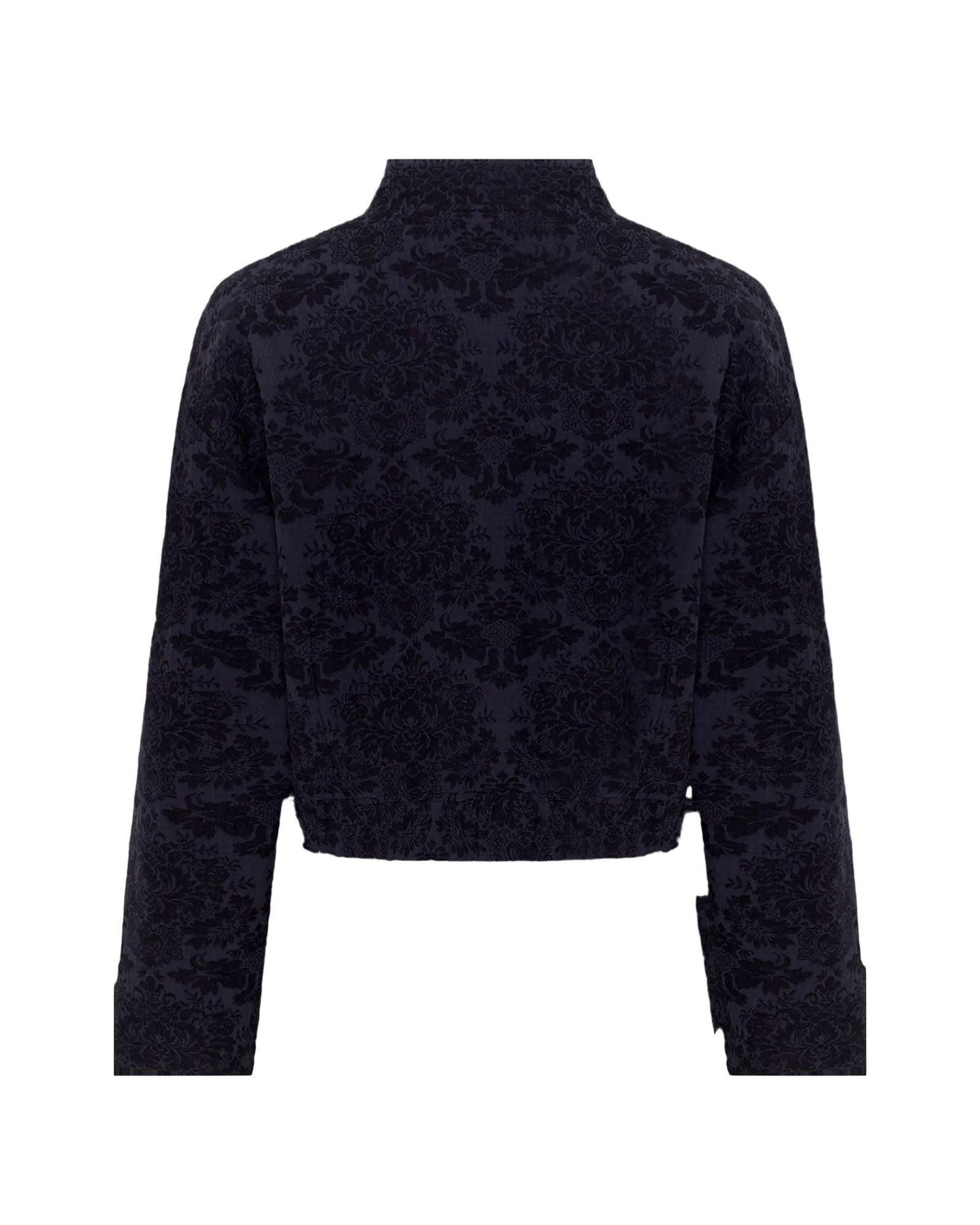 Jacke von Moss Copenhagen in einem dunkelblauen Farbton mit floralem Muster über dem gesamten Stoff. Die Jacke hat lange Ärmel und einen Stehkragen.