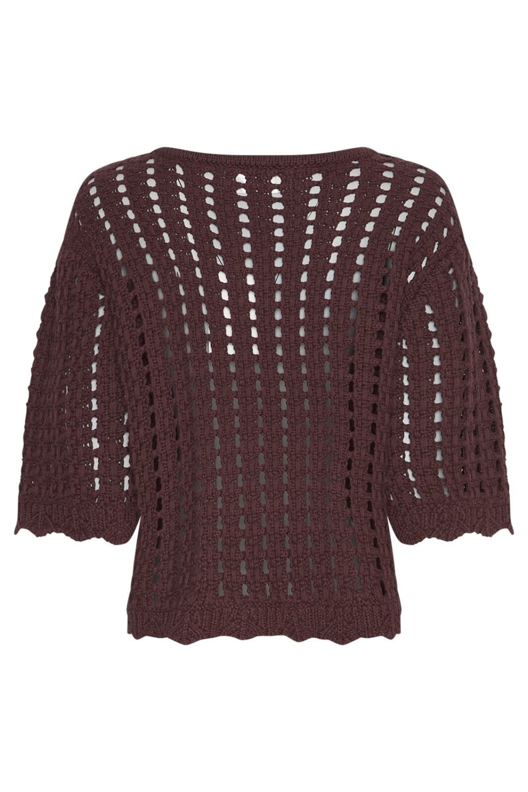 Strickpullover in Braun mit offenem Strickmuster und dekorativen Nähten. Sie hat einen runden Halsausschnitt und 3/4-Ärmel mit gewelltem Saum.