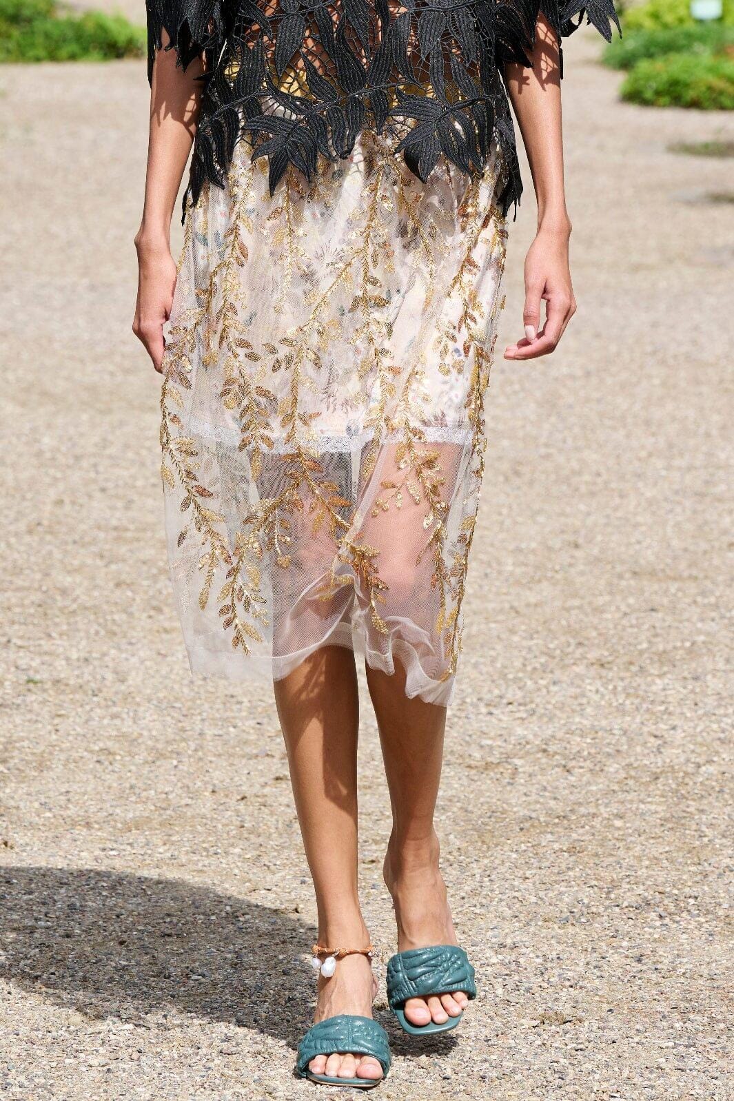 Transparenter Rock von Munthe mit Goldblattstickerei. Der Rock besteht aus einem leichten, transparenten Material mit detaillierten Stickereien in Goldtönen mit Blattmotiven.