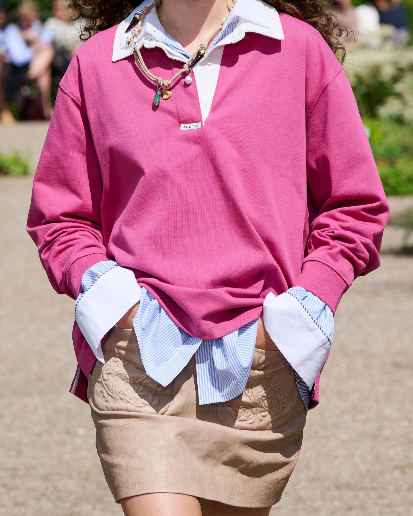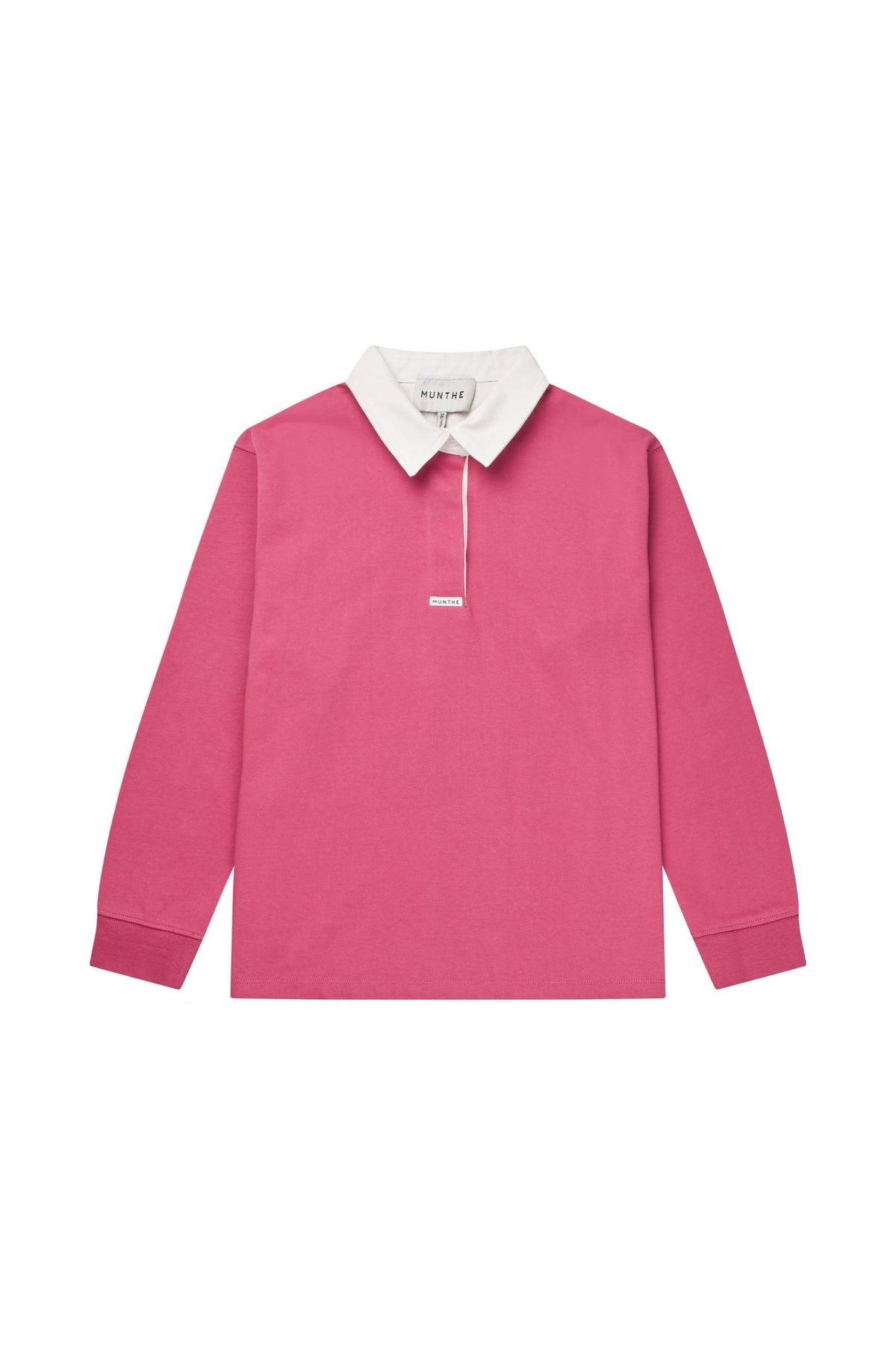 Langærmet polo-trøje fra Munthe i en pink-lilla bærfarve. Trøjen har hvide detaljer på kraven og manchetterne.
