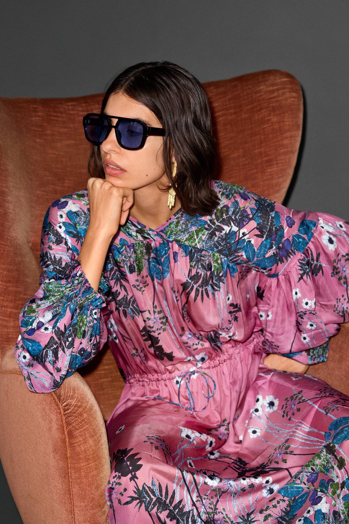 Langärmliges Kleid von Munthe aus einer Mischung aus Viskose und Seide. Das Kleid hat einen Blumenprint in Pink- und Beerentönen mit einer lockeren Passform.