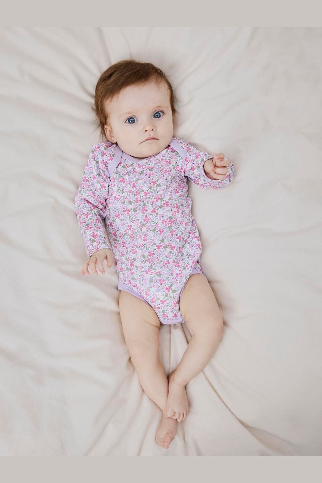 Body von Name It in Helllila mit kleinem Blumenmuster. Hergestellt aus einer Mischung aus Bio-Baumwolle und normaler Baumwolle.