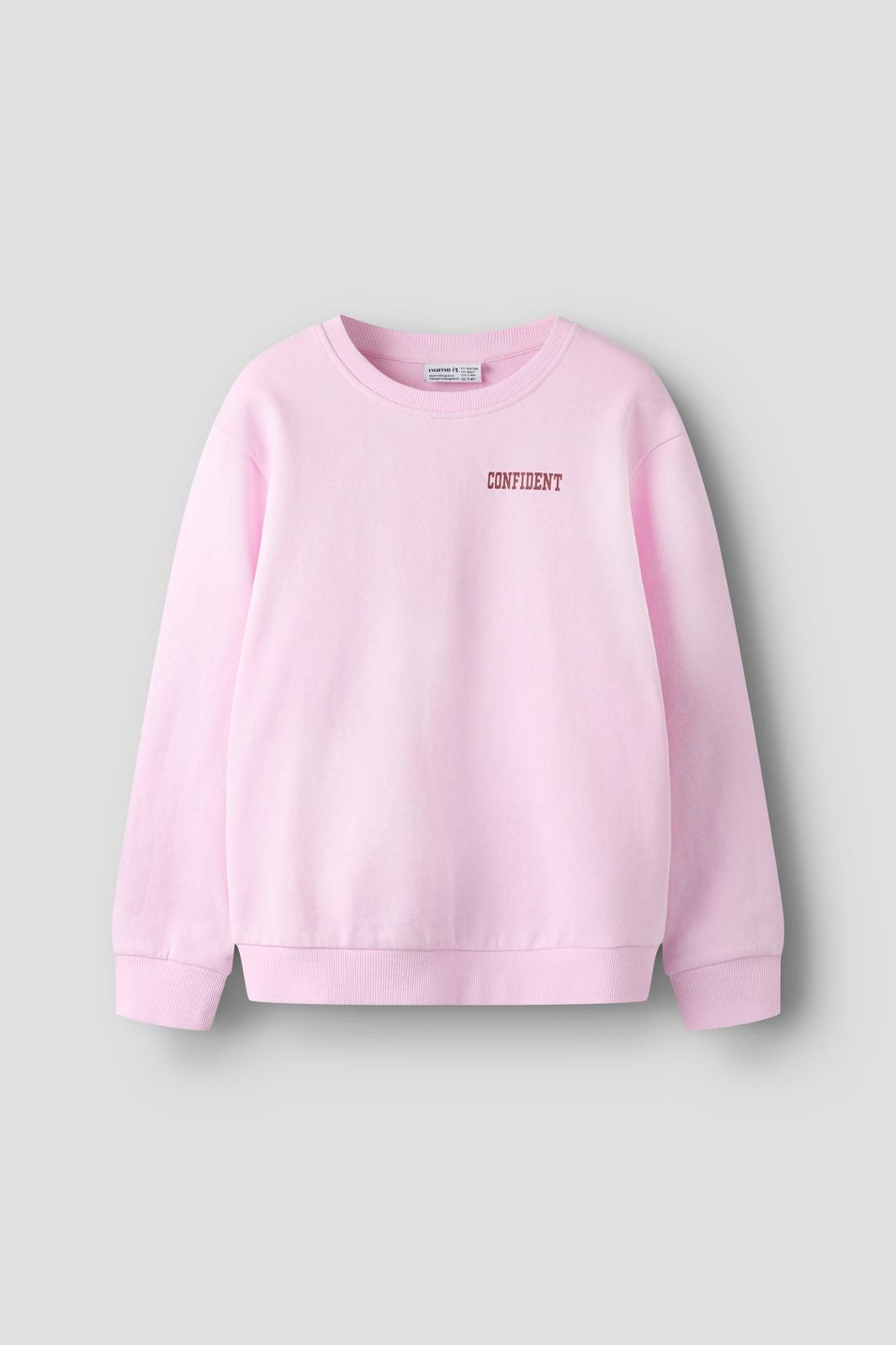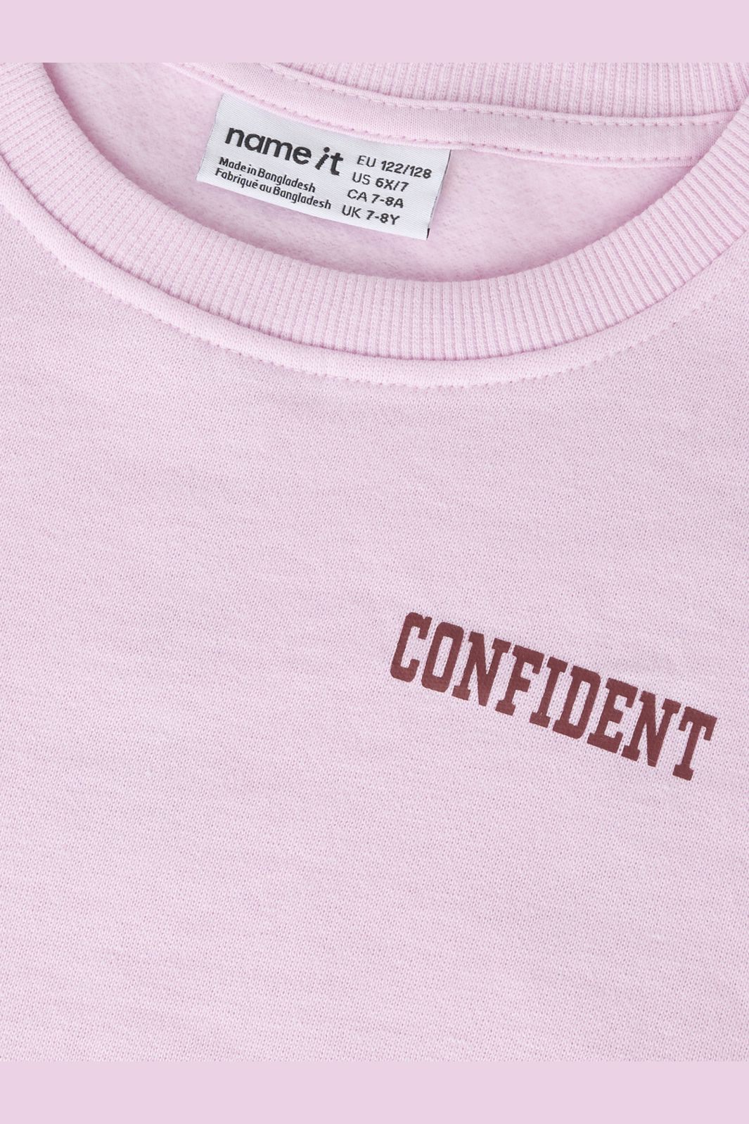 Rosa Sweatshirt von Name It mit dem Aufdruck CONFIDENT vorne und hinten. Das Sweatshirt hat einen Rundhalsausschnitt und lange Ärmel.