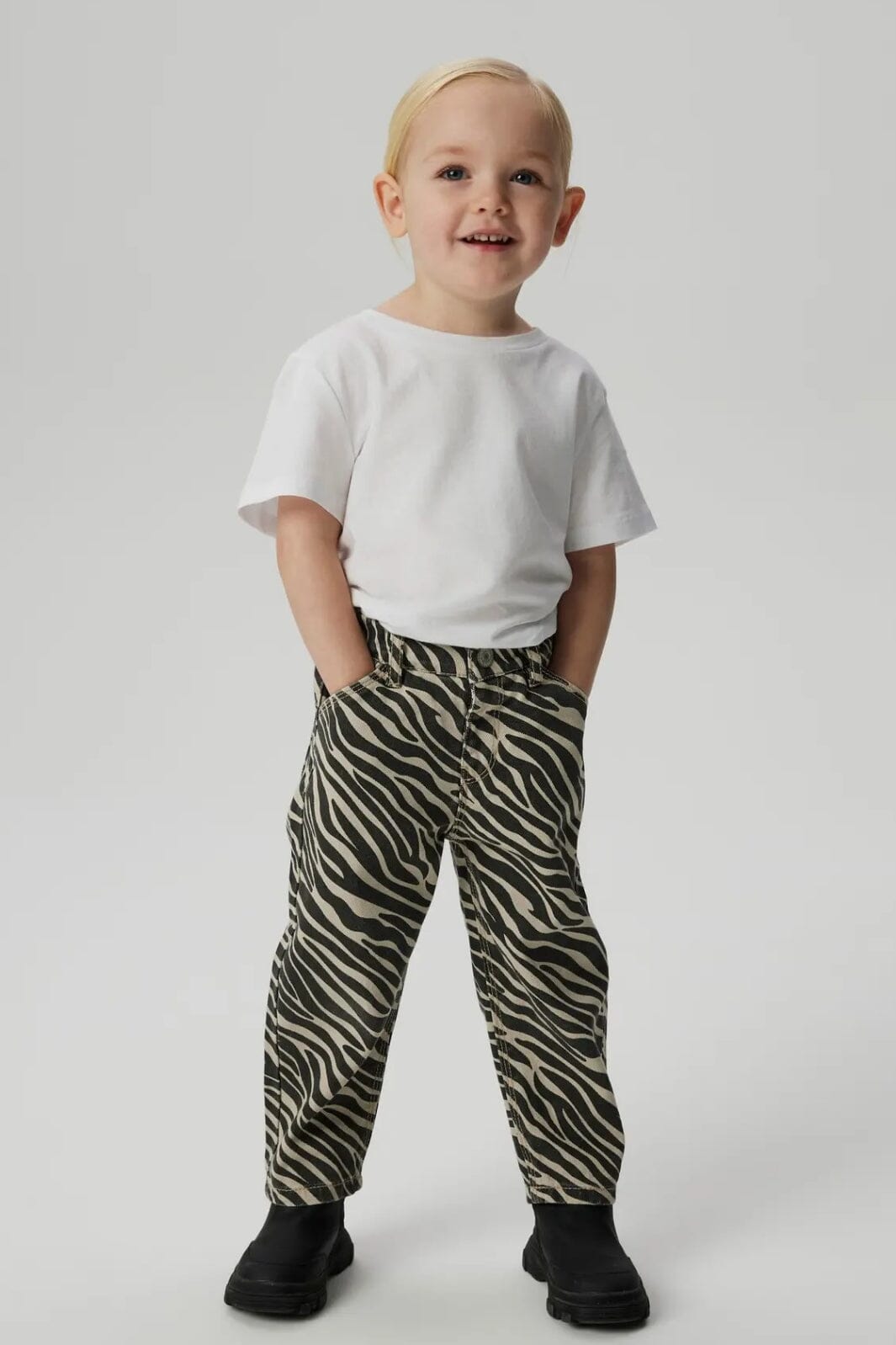 Twillhosen mit Zebramuster in Beige und Schwarz. Die hohe Taille und der lockere Schnitt bieten viel Bewegungsfreiheit. Die Hosen haben einen Druckknopfverschluss und Taschen sowohl vorne als auch hinten.