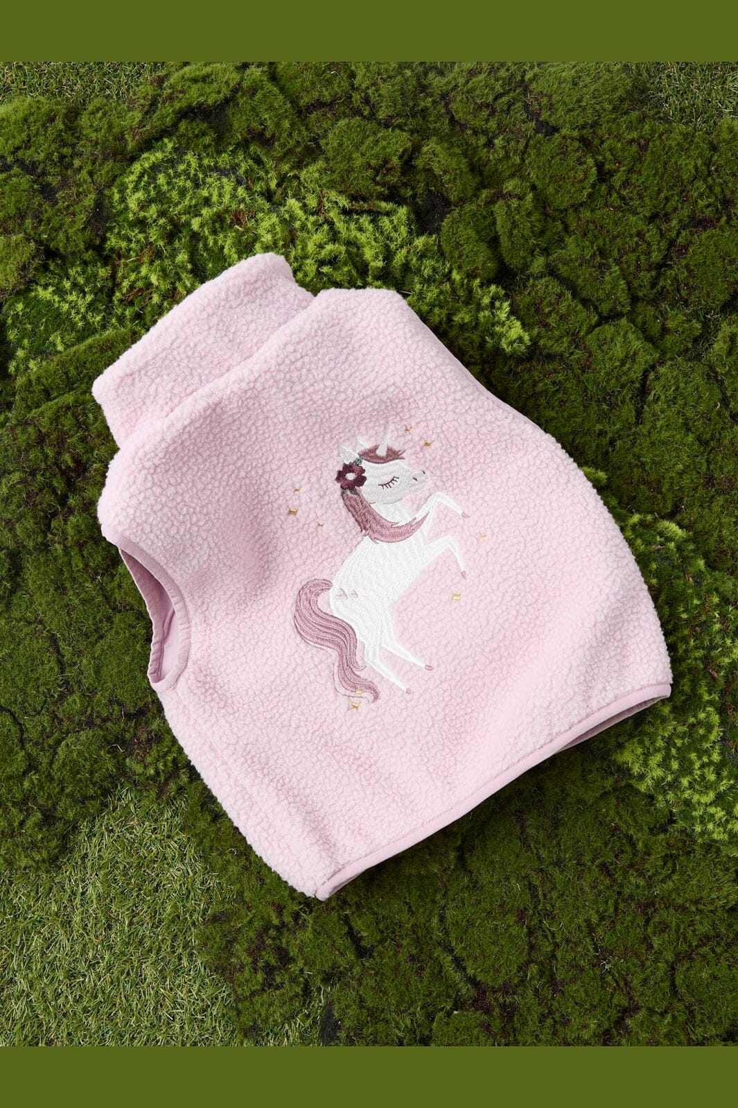 Sherpa-Weste von Name It in rosa-lila Farbe. Die Weste hat eine weiche, flauschige Textur und ein gesticktes Einhorn auf der Rückseite.