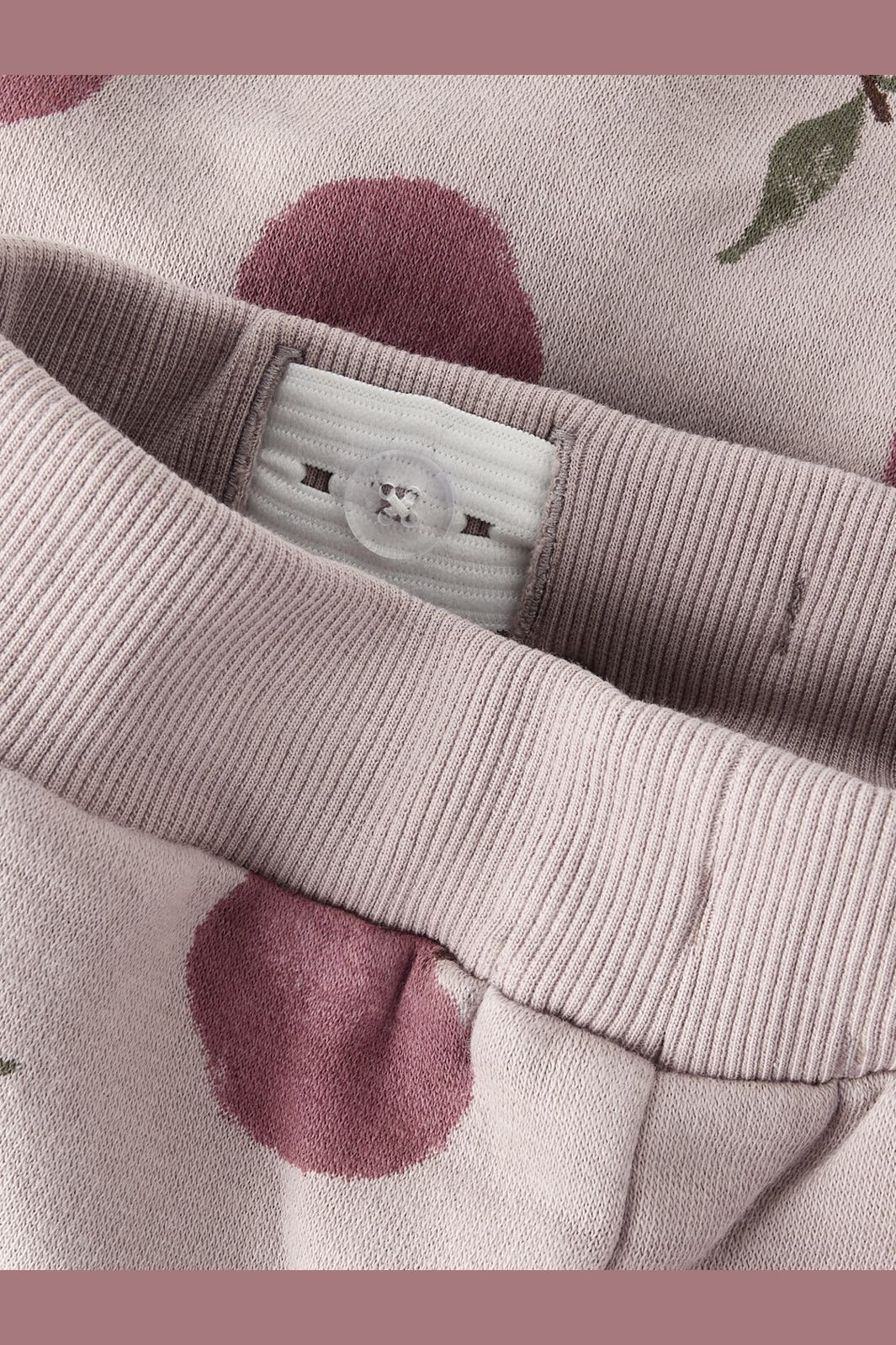 Sweatpants von Name It in einem warmen beige-braunen Farbton mit einem Apfelmuster in roten und grünen Nuancen.