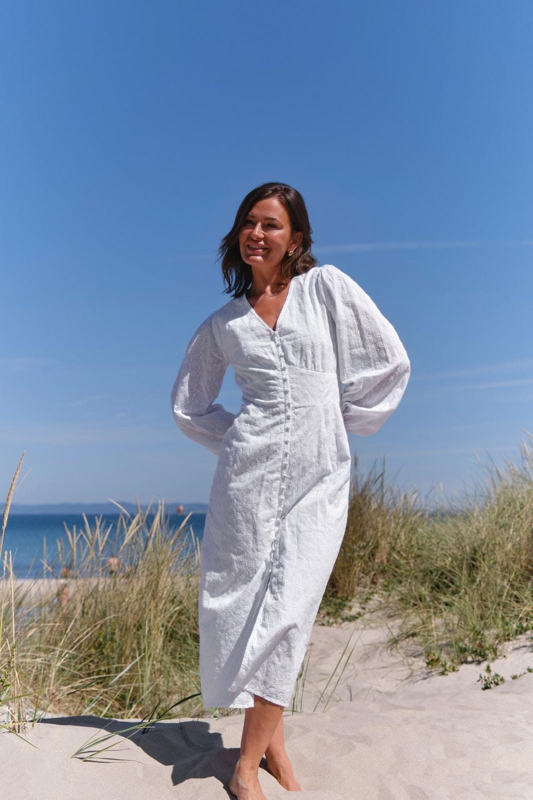 Weißes Kleid von Neo Noir aus Broderie Anglaise-Qualität. Das Kleid hat ein Blumenstickmuster über den gesamten Stoff, einen V-Ausschnitt und Knöpfe entlang der Vorderseite. Die langen Ärmel haben Puff an den Schultern.